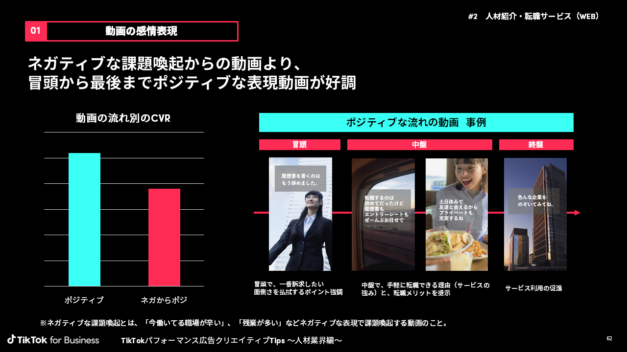 動画の流れが、仕事に対するネガティブな表現からポジティブな表現へと変化するクリエイティブと、冒頭から最後までポジティブな表現のクリエイティブでは、一貫してポジティブな表現の方がCVRが高くなっています。