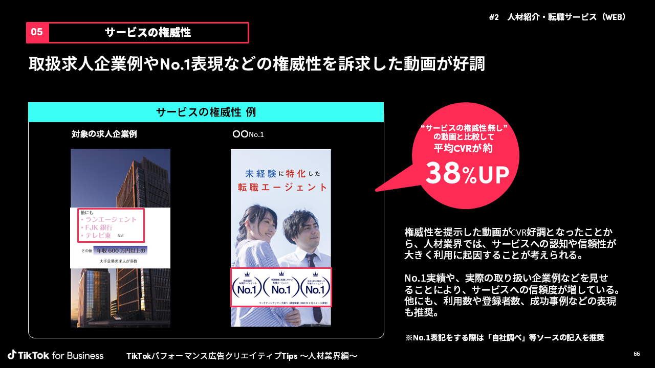 人材業界では、人材紹介・転職サービスの認知度や信頼性が、サービス利用に大きな影響を与えており、取扱求人企業の具体名やNo.1表現などの権威性を示す動画が好調となっています。「サービスの権威性の表示あり」と「サービスの権威性の表示なし」の動画の比較では、「表示あり」の平均CVRが約38%高くなっています。
