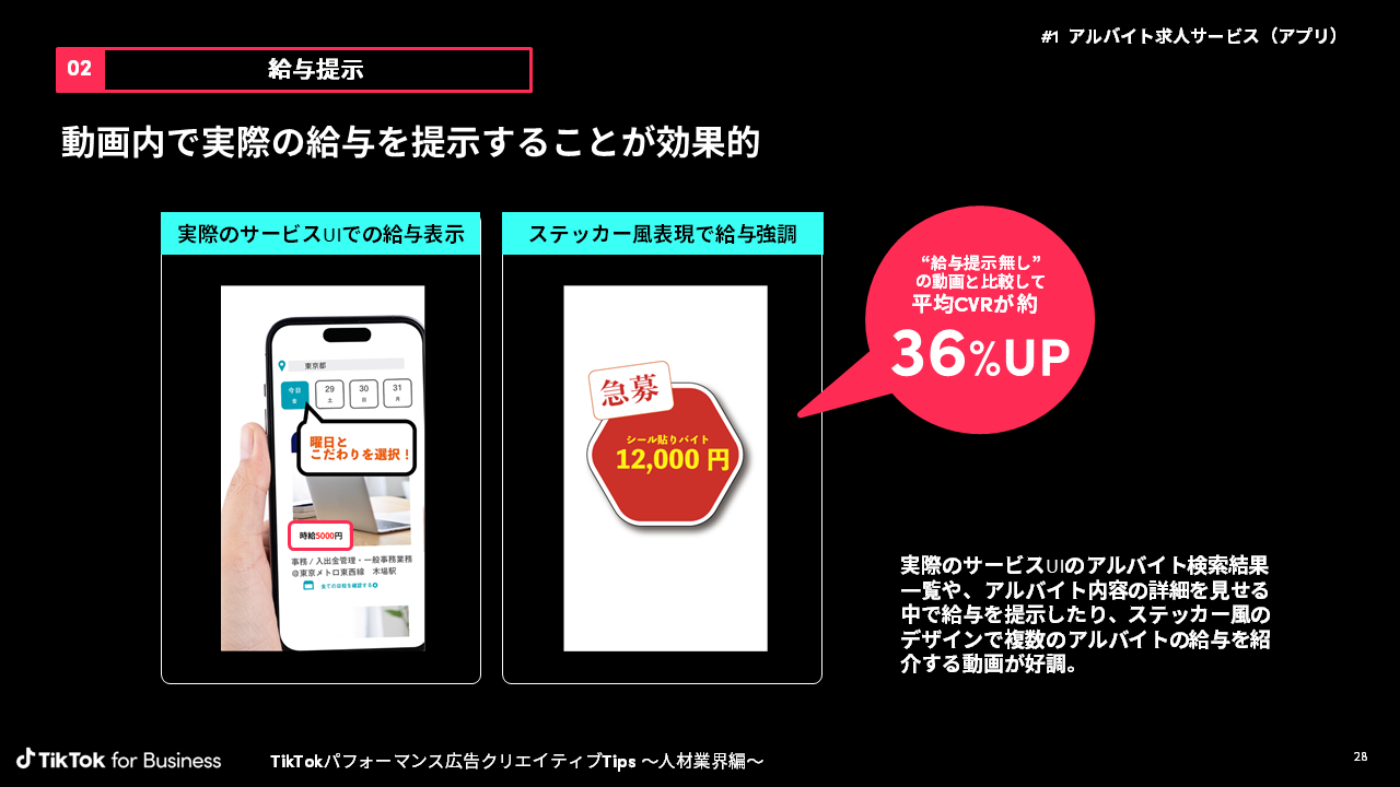 動画内に実際のサービスUIを表示し、そこに給与額を提示するとCVRが高くなる傾向にあります。「給与提示あり」と「給与提示なし」の動画の比較では、「給与提示あり」の平均CVRが約36%高くなっています。ステッカー風表現を使って、給与額を強調したり、複数のアルバイトの給与を紹介するクリエイティブも効果的です。