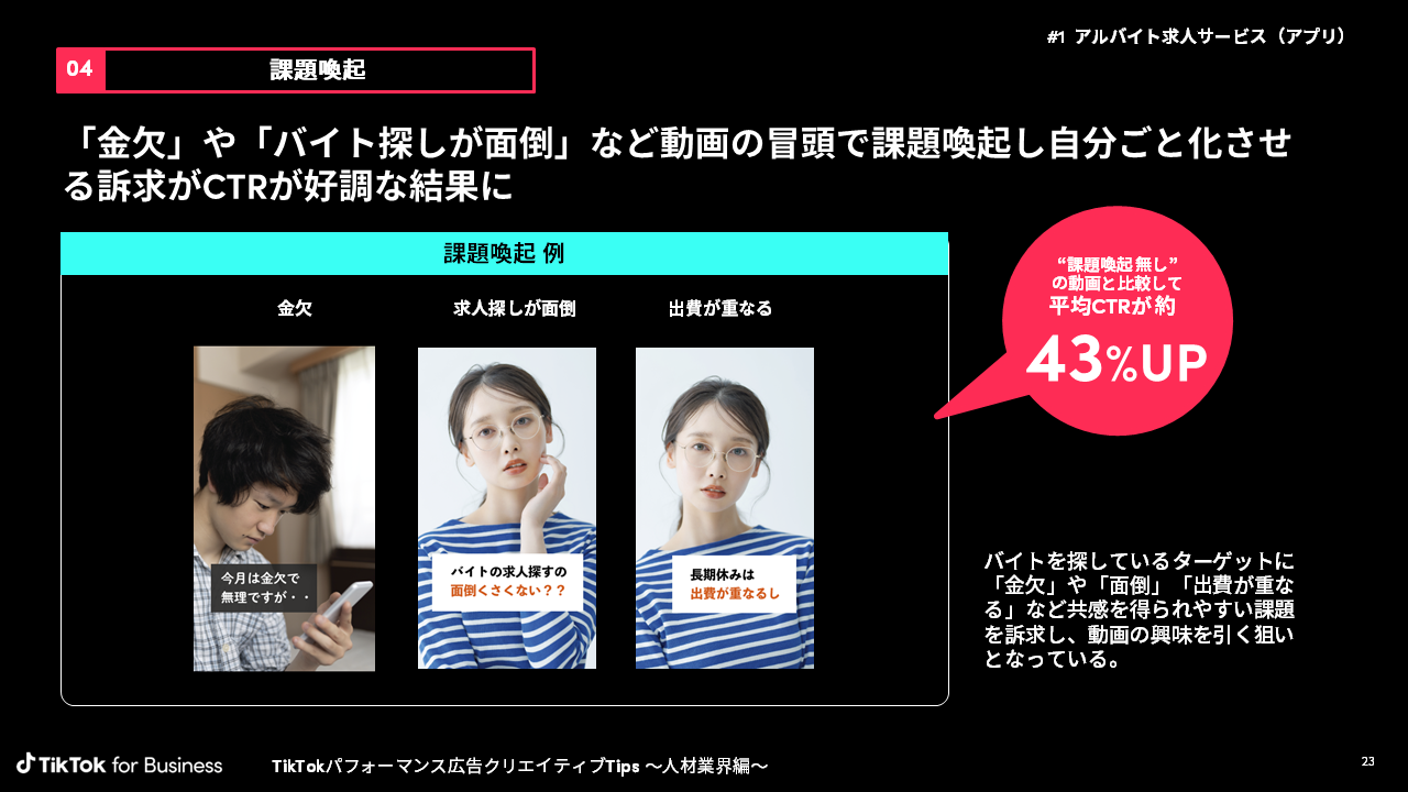アルバイトを探しているターゲットに向けて、「お金が足りない」「バイト探しが面倒」「出費が重なる」などリアルな課題を見せて自分事化させることがCTRの好調につながっています。「課題の喚起あり」と「課題の喚起なし」の動画の比較では、「課題の喚起あり」の平均CTRが約43%高くなっています。