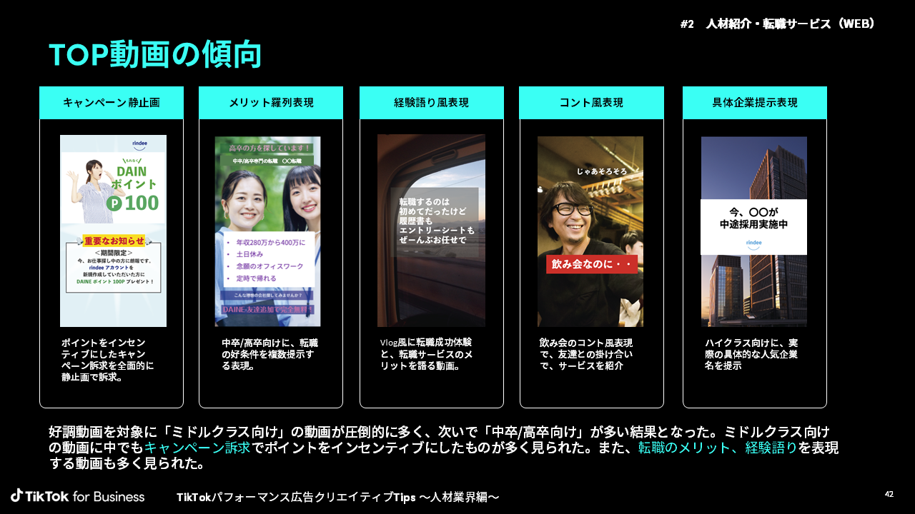 人材紹介・転職サービスでは、ミドルクラス向けの動画が圧倒的に多く、その中でもインセンティブを表示してキャンペーンを訴求する動画が好調です。また、転職の成功体験や転職サービスのメリットを語る表現も効果を高める傾向にあります。
