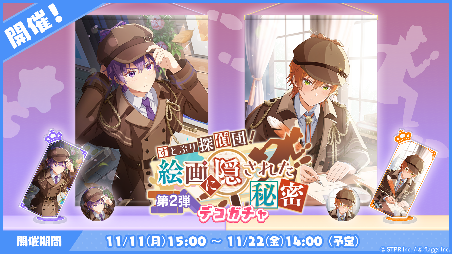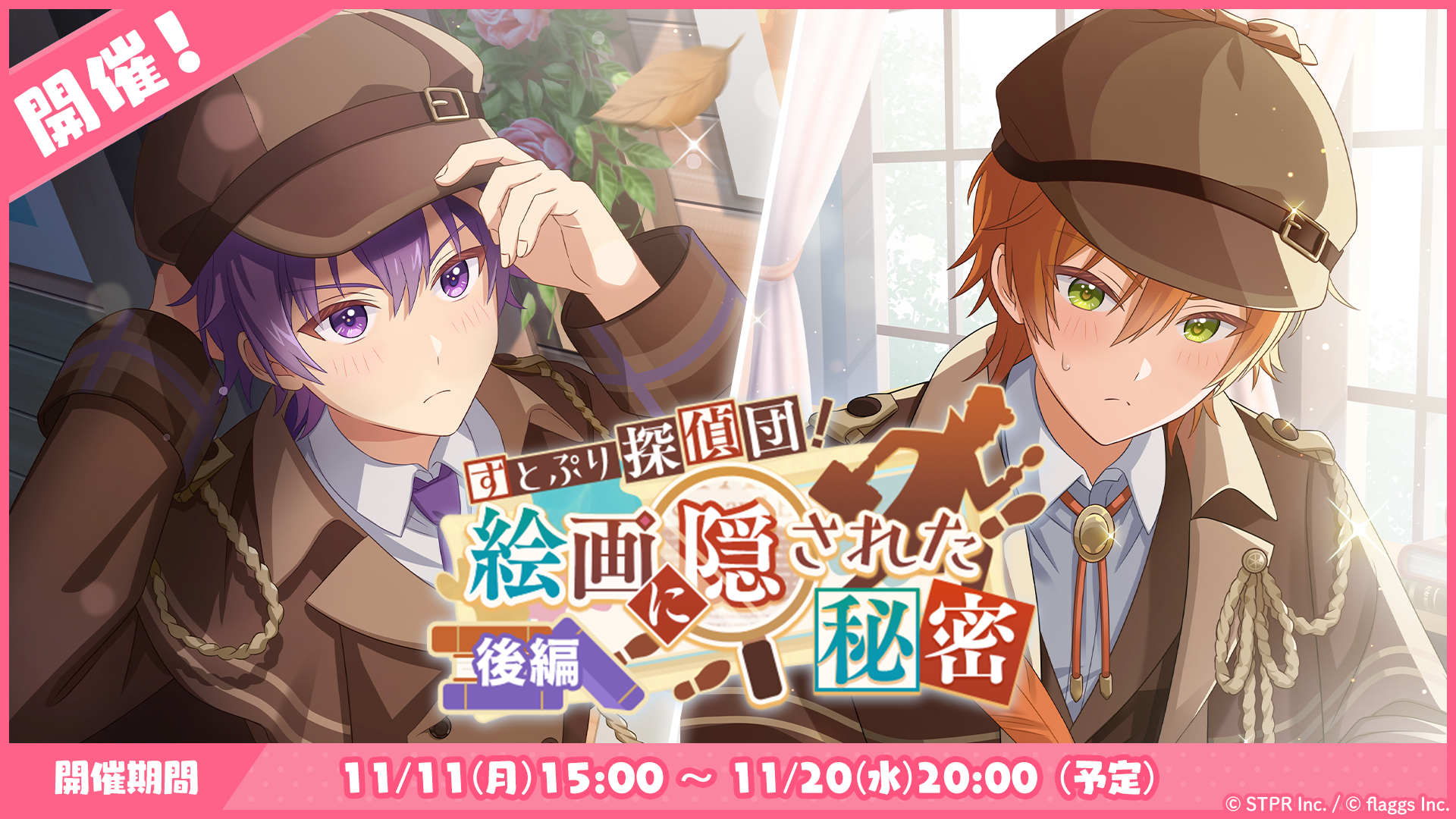 株式会社flaggs(フラッグス)(本社:東京都品川区、代表取締役CEO:吉江 直人)と株式会社STPR(本社:東京都渋谷区、代表取締役:柏原 真人、以下STPR)は、本日11月11日(月)に2.5次元アイドルグループ「すとぷり」の公式ゲームアプリ「すとぷりWith!!(通称:すとうぃず)」のゲーム内イベント「すとぷり探偵団!絵画に隠された秘密 後編」の開催についてお知らせいたします。