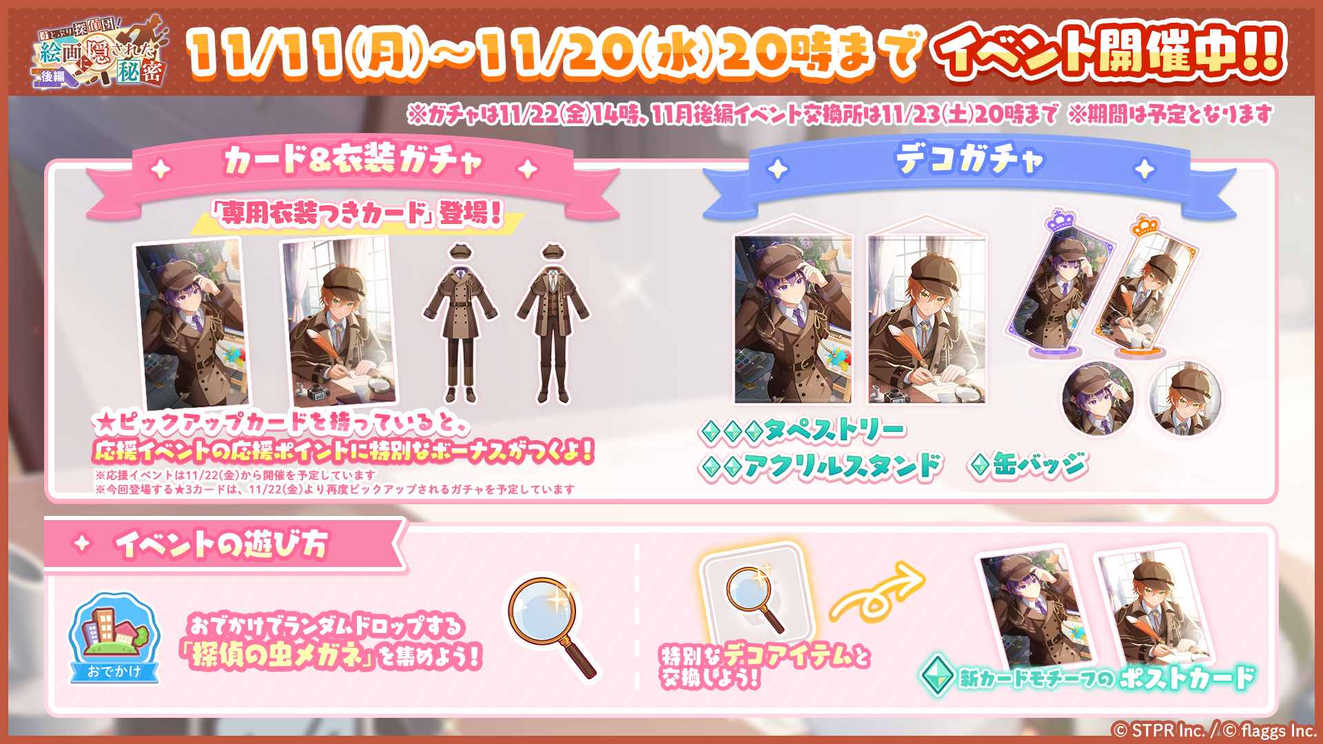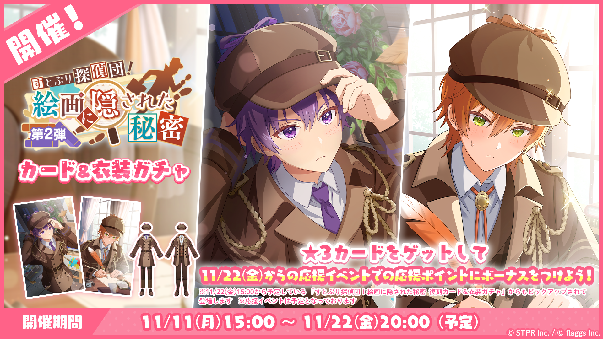 本日11月11日(月)より、新たな★3カードがピックアップ登場する「すとぷり探偵団!絵画に隠された秘密 第2弾 カード&衣装ガチャ」が開催中です。