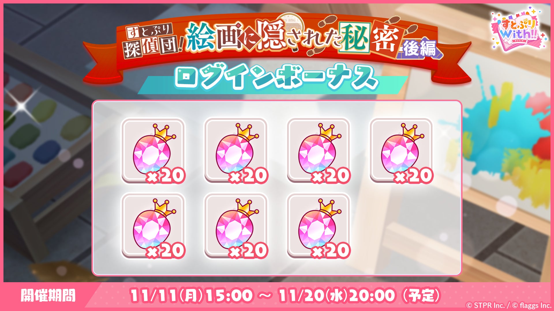 本日11月11日(月)より、「すとぷり探偵団!絵画に隠された秘密 後編 ログインボーナス」を実施中です。