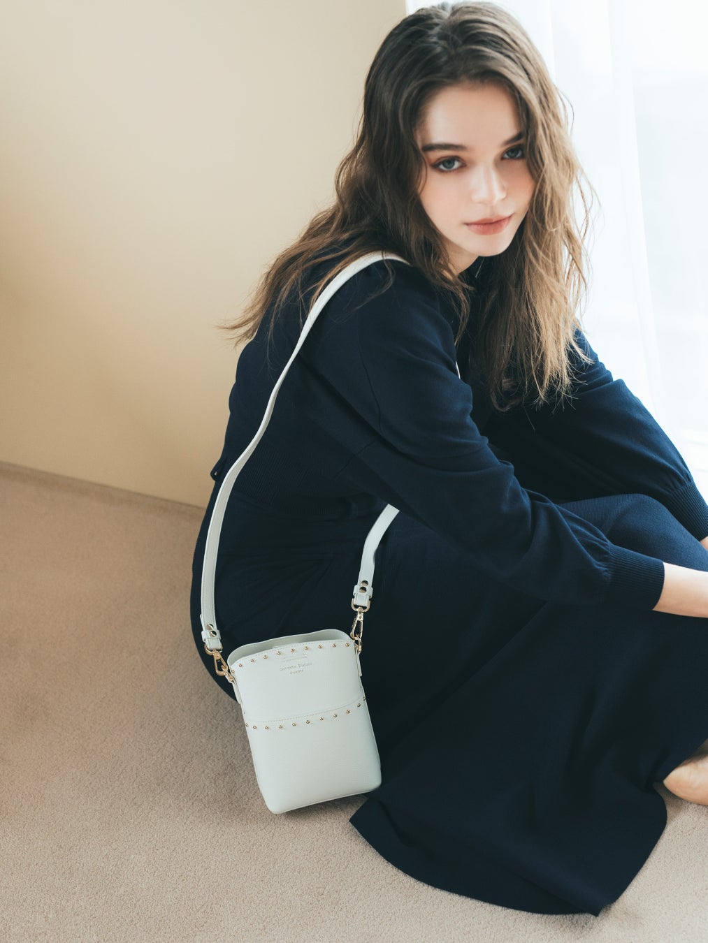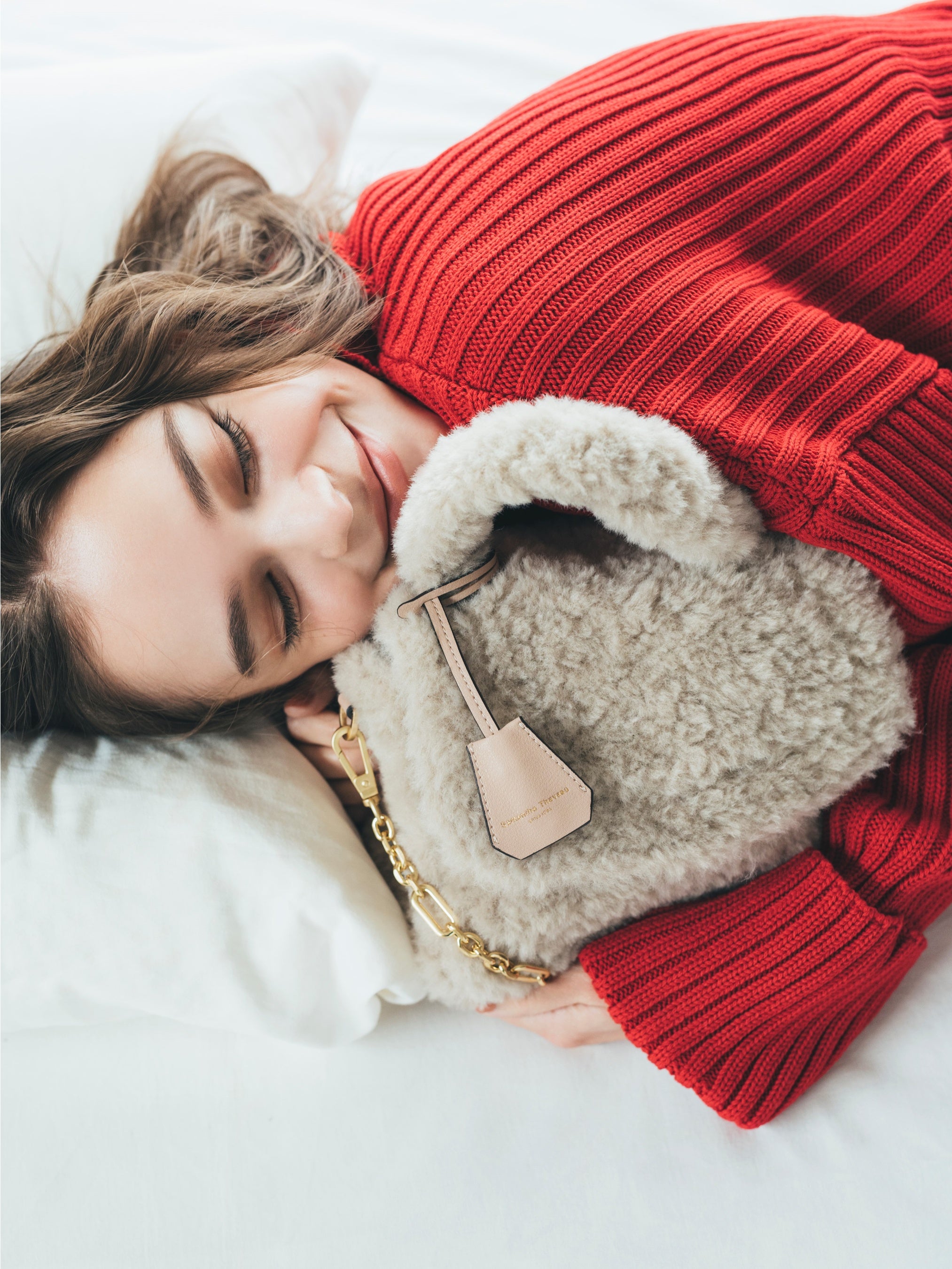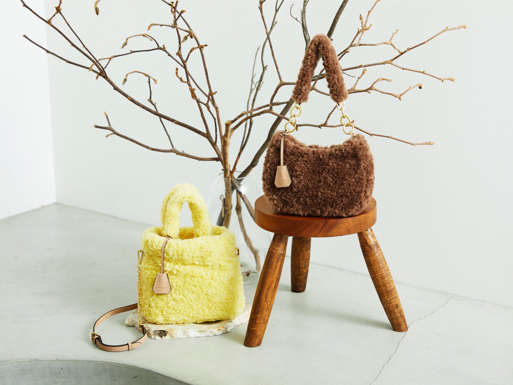 柔らかなファーの質感と、ショルダーチェーンのメタルの輝きでほんのりモードな仕上がりに。