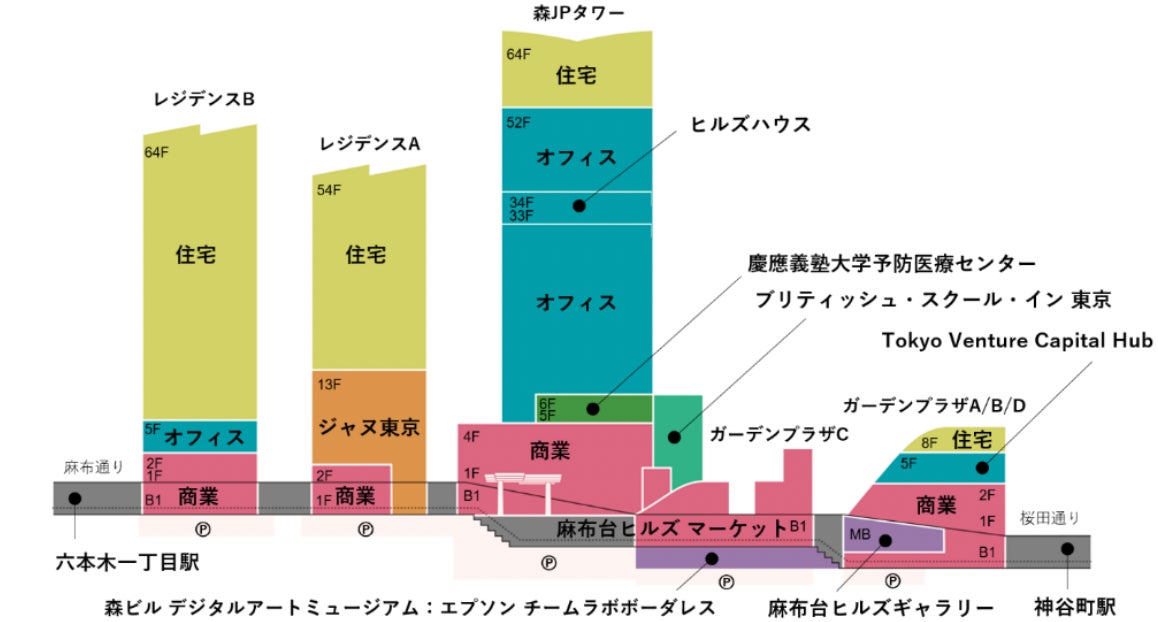 麻布台ヒルズは、アークヒルズに隣接し、文化都心・六本木ヒルズと、グローバルビジネスセンター・虎ノ門ヒルズの中間、文化とビジネスの両方の個性を備えたエリアに立地しています。約8.1ha もの広大な計画区域は圧倒的な緑に包まれ、約6,000㎡の中央広場を含む緑化面積は約24,000㎡を誇ります。そこに、延床面積約861,700㎡、オフィス貸室面積約214,500㎡、住戸数約1,400戸を複合的に開発。中心となる森JP タワーの高さは約330m、就業者数約20,000 人、居住者数約3,500 人、年間来街者数約3,000万人を見込み、そのスケールとインパクトは「六本木ヒルズ」に匹敵します。麻布台ヒルズは、当社が理想とする「都市の中の都市(コンパクトシティ)」であり、これまでのヒルズで培ったすべてを注ぎ込んだ「ヒルズの未来形」です。