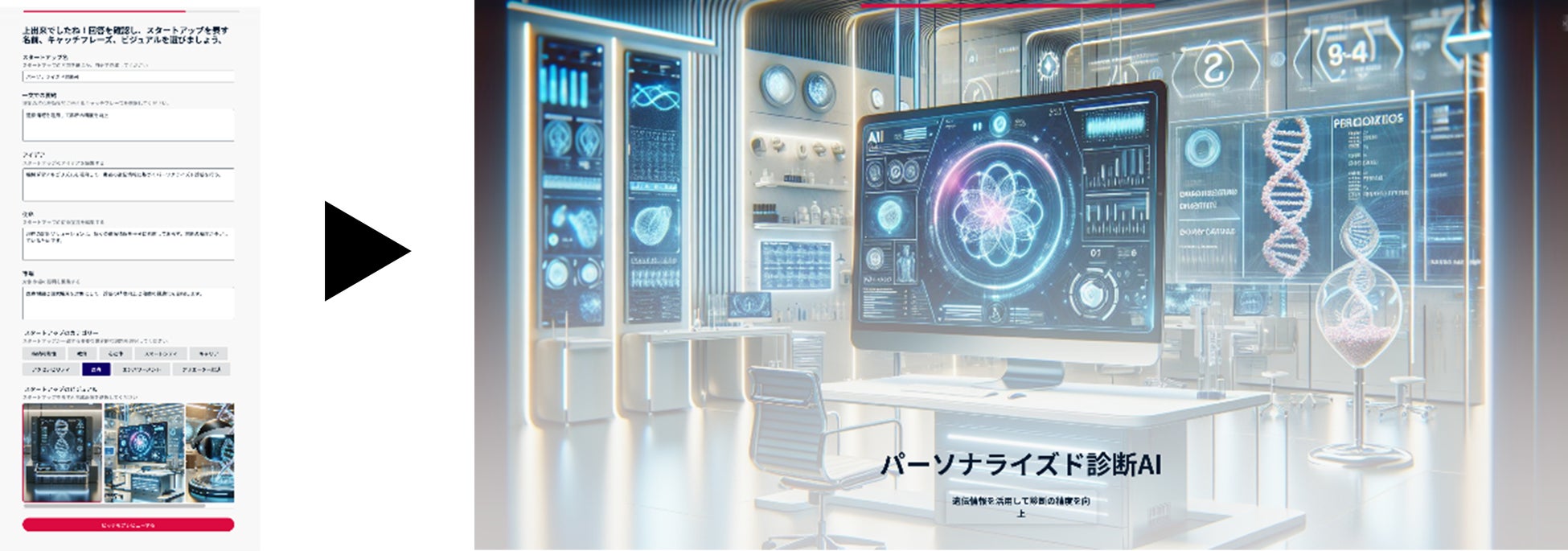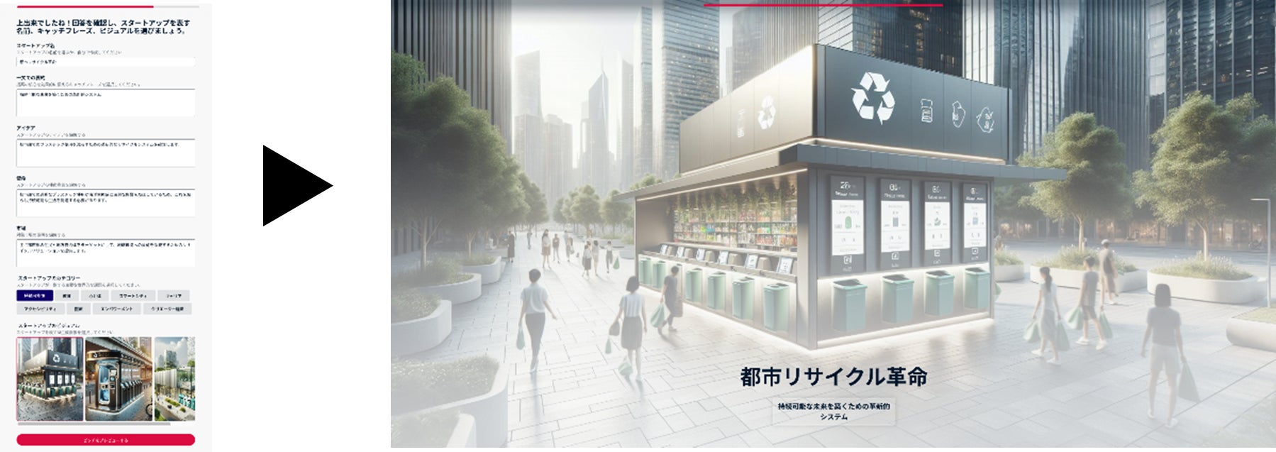 AIを活用した応募フォームの入力画面と、作成されるビジネスプランのイメージ