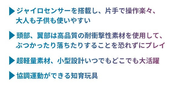 - EPP素材でできており、落下に強いです。 また、より安全な高速回転プロペラを備えており、他の飛行玩具とは異なります。