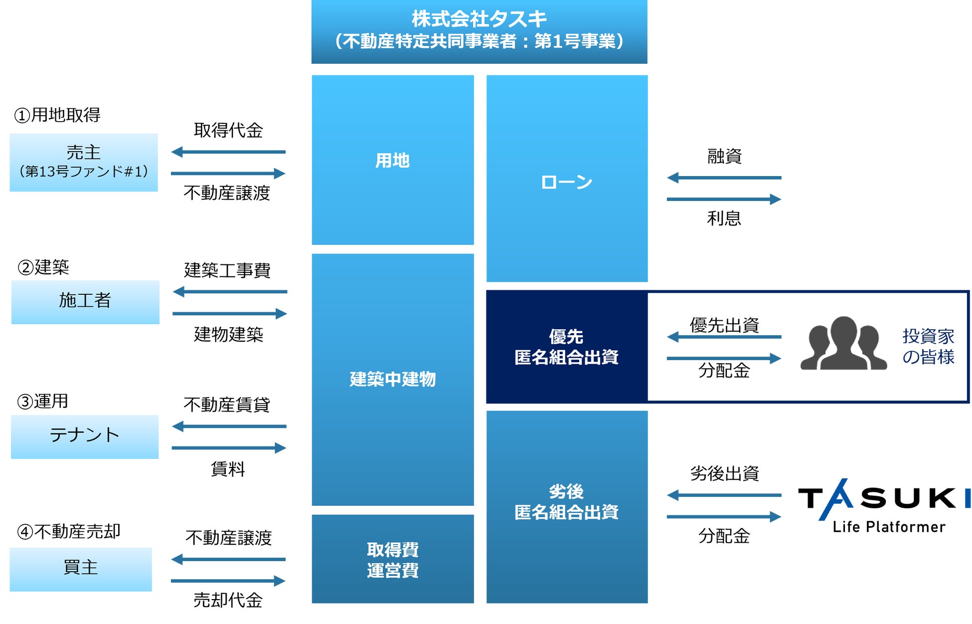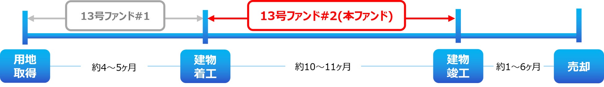 本ファンドは、用地の取得から建築確認済証の取得・着工までを運用期間としているファンド「タスキ キャピタル重視型 第13号ファンド#1」の次フェーズとして、着工から竣工までを運用期間とする「タスキ キャピタル重視型 第13号ファンド#2」を組成するものです。同一物件に対し、プロジェクトの進行度合いによる事業リスクの程度に応じて段階的にクラウドファンディングを組成し、投資家のみなさまの新たな投資機会の創出と、資金流動性の向上を図ります。