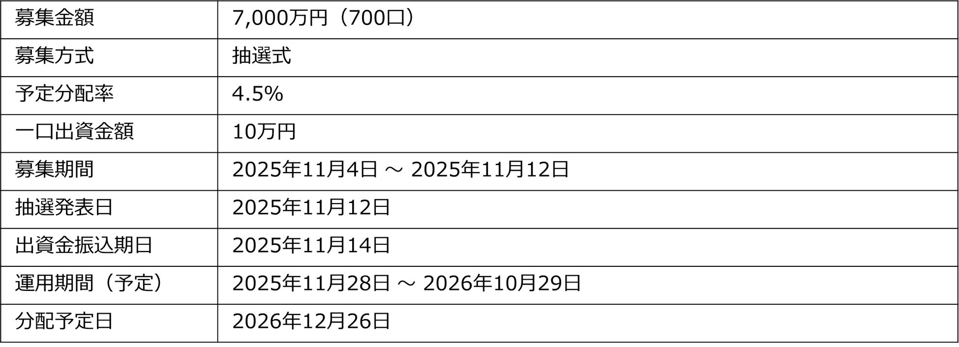 株式会社タスキホールディングス(本社:東京都港区、代表取締役社長:柏村 雄)のグループ会社である株式会社タスキ(本社:東京都港区、代表取締役社長:村田浩司、以下、タスキ)は、不動産投資型クラウドファンディングサービス「TASUKI FUNDS」において、2025年11月4日より「タスキ キャピタル重視型 第13号ファンド#2」の投資募集をいたしますので、お知らせします。