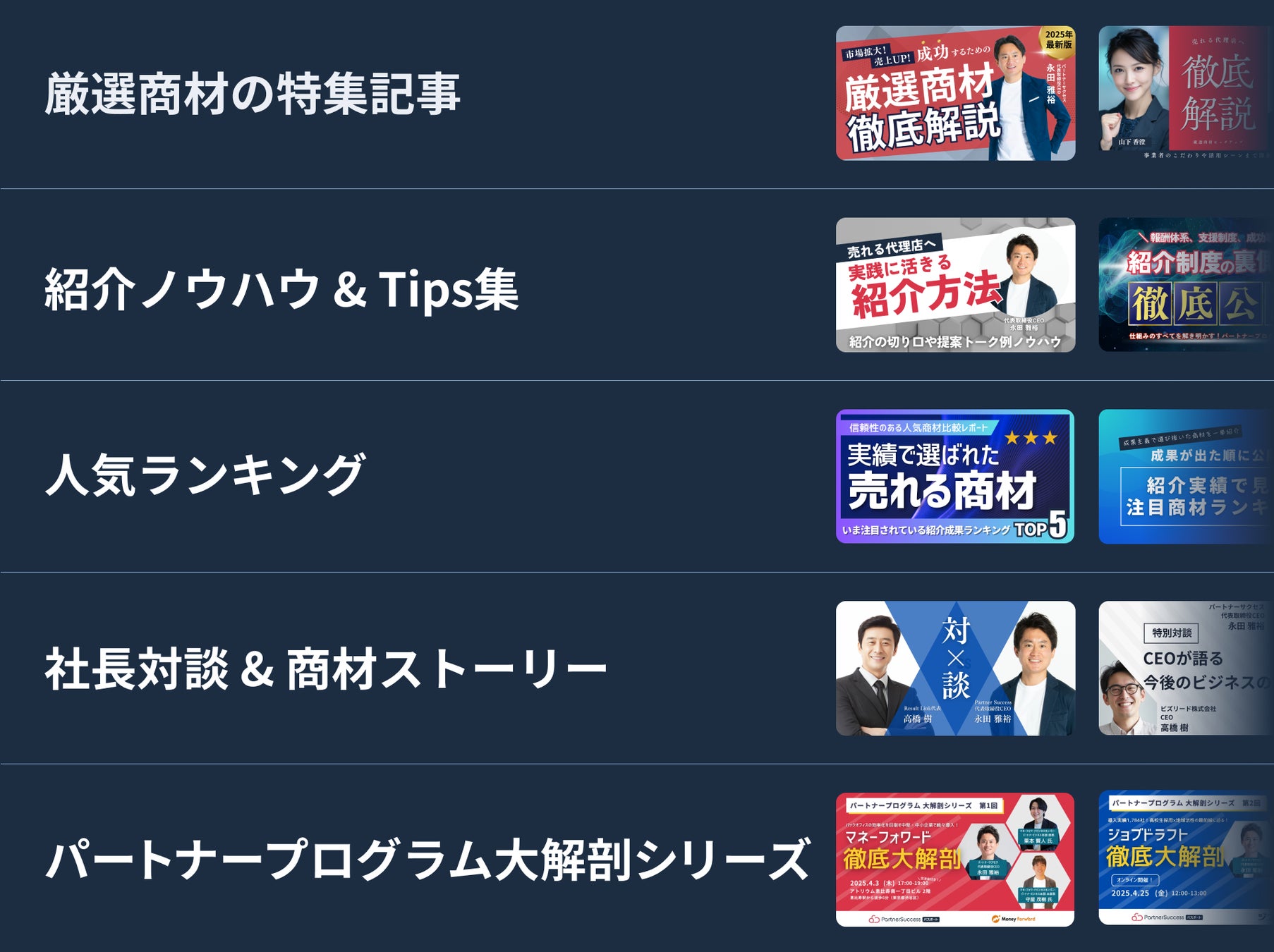 商材の魅力を深掘りする特集記事や、紹介方法のノウハウ、ランキング、掲載企業の想いや裏側を伝える対談動画など、紹介活動を後押しするあらゆる情報が1つに集約されています。