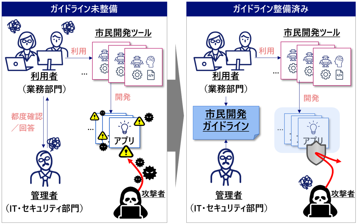 IT人材不足や市民開発ツールの普及を背景に、企業における市民開発が活発になっています。直感的な操作で比較的簡単にアプリケーション開発等が行える一方、市民開発で作られたアプリケーションが乱立した結果、脆弱なアプリケーションが意図せず組織内に広がってしまうケースが見受けられます。さらに、アプリケーションの外部公開設定や外部システムとの連携方法に不備があった場合には、不正アクセスや情報漏洩等の被害につながる可能性もあります。