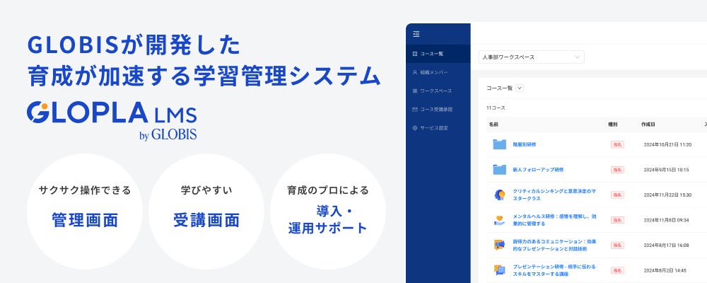 「GLOPLA LMS」は、6,700社超の研修実績をもとに設計されたUI/UXで、快適な研修設計と受講体験をお届けする学習管理システムです。直感的に操作できるデザインとこだわり抜かれた機能により、集合研修や動画学習、e-Learning などさまざまな研修を一元管理できます。
