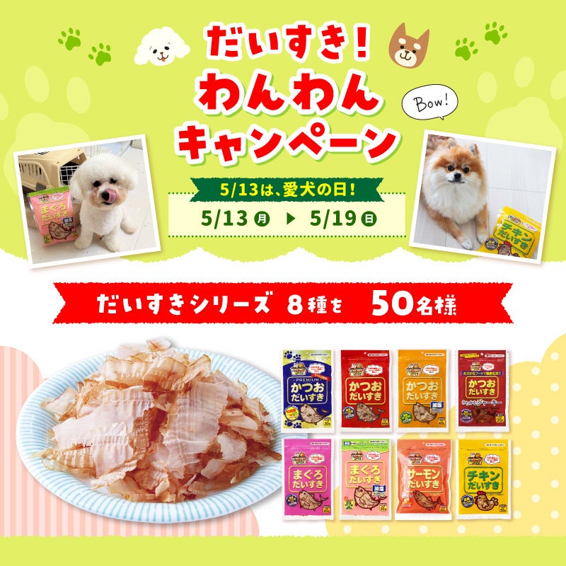 かつお節・だしと、海洋資源を通じて健康と食文化の発展に貢献するマルトモ株式会社(社長:今井均 本社:愛媛県伊予市)は、「愛犬の日」である5月13日より、X(旧 Twitter)にて「だいすきシリーズ全8種」が当たるキャンペーンを実施します。