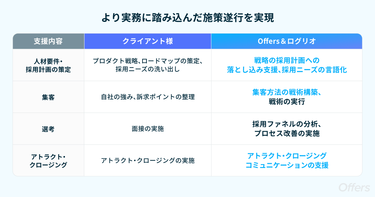そういった環境の中、Offersではエンジニア属性に合わせたプロダクト開発を行うことで企業のエンジニア採用成功を支援して参りましたが、採用プロセスにおいて、より実務に踏み込んだ支援を行っていきたいと考えておりました。一方、ログリオにとってはより幅広くクライアントにフィットするエンジニア採用プラットフォームを活用することで、エンジニア採用支援の幅を広げたいとの考えがありました。