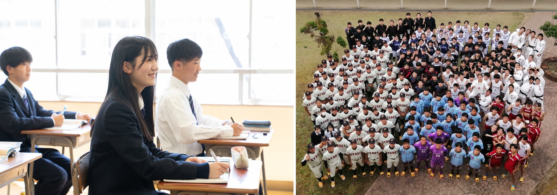普通科‧商業科あわせて5つのコースを設けるとともに、各⾃の進路希望に応じた学⼒向上プログラムを⽤意し、個性を伸ばすために最適な学習ができるシステムを構築しています。⽂武両道に優れた明るく希望に満ちあふれた校⾵です。