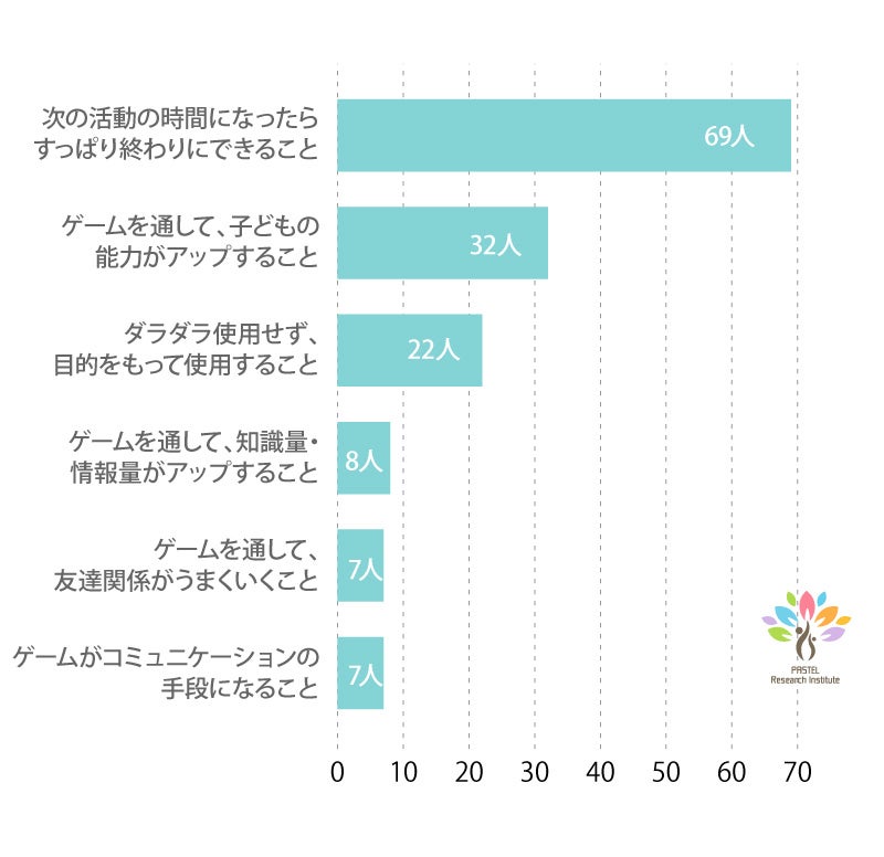 ゲームと我が子の付き合い方について、お母さんの本音は、「時間がきたらすっぱりゲームをやめて活動を切り替えてほしい」と思っていることが分かりました。