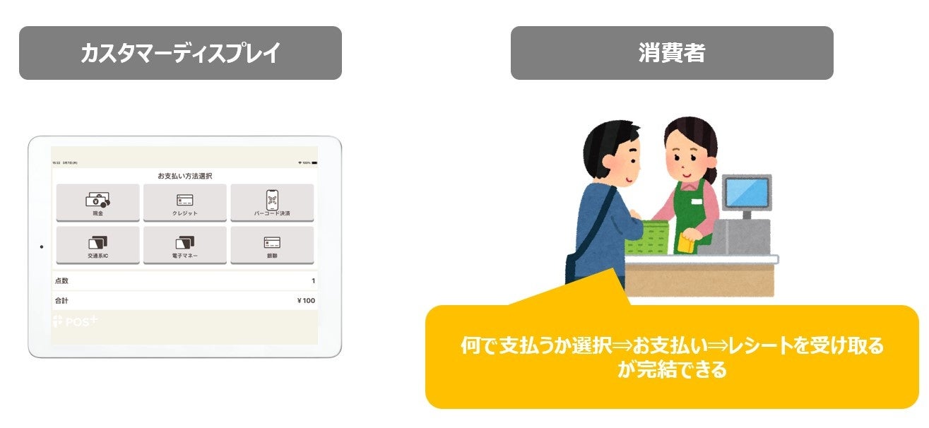 この度、「POS+ retail」で新しく実装されたセミセルフ機能は、小売店における従業員のレジ会計作業の工数を削減し、消費者が支払いを行っている間に、袋詰め作業や配送手続きなど別の作業を平行して行うことができるため、レジ行列の緩和や生産性向上に貢献することができるサービスです。