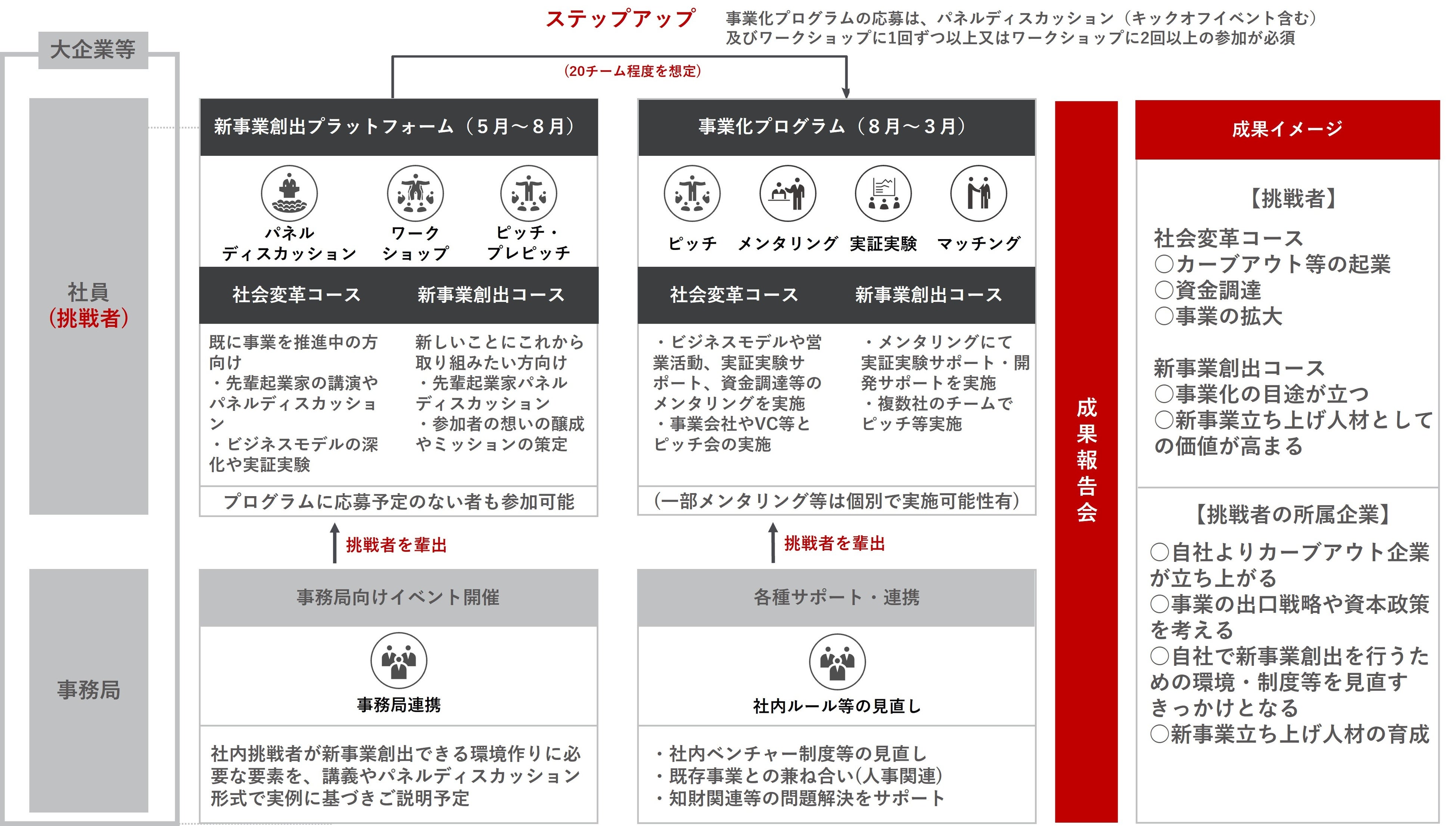 本事業の目的に共感し、既に自社のプログラムで事業を推進してきており、成長や変革を起こしたい意欲のある大企業や、自社内のアイデア・シーズ・人材等を活かして新事業を創出する意欲のある大企業等事務局の方も、募集します。