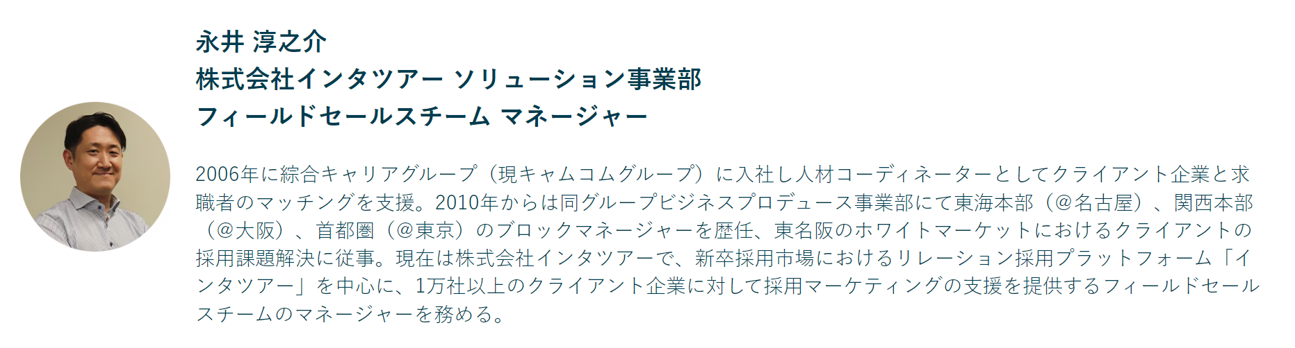 2006年に綜合キャリアグループ(現キャムコムグループ)に入社し人材コーディネーターとしてクライアント企業と求職者のマッチングを支援。2010年からは同グループビジネスプロデュース事業部にて東海本部(@名古屋)、関西本部(@大阪)、首都圏(@東京)のブロックマネージャーを歴任、東名坂のホワイトマーケットにおけるクライアントの採用課題解決に従事。現在は株式会社インタツアーで、新卒採用市場におけるリレーション採用プラットフォーム「インタツアー」を中心に、1万社以上のクライアント企業に対して採用マーケテイングの支援を提供するフィールドセールスチームのマネージャーを務める。
