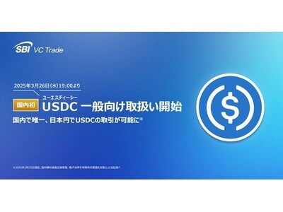 SBIホールディングス株式会社(本社:東京都港区、代表取締役会長兼社長:北尾 吉孝)の連結子会社で暗号資産交換業を営むSBI VCトレード株式会社(本社:東京都港区、代表取締役社長:近藤 智彦、以下「当社」)は、2025年3月26日(水)の19時より、「ユーエスディーシー(USDC)」の一般向けの取扱いを開始することをお知らせいたします。これにより当社は国内で唯一、初めてとなる一般のお客さま向けのUSDC取引サービスを提供することとなります。(※1)