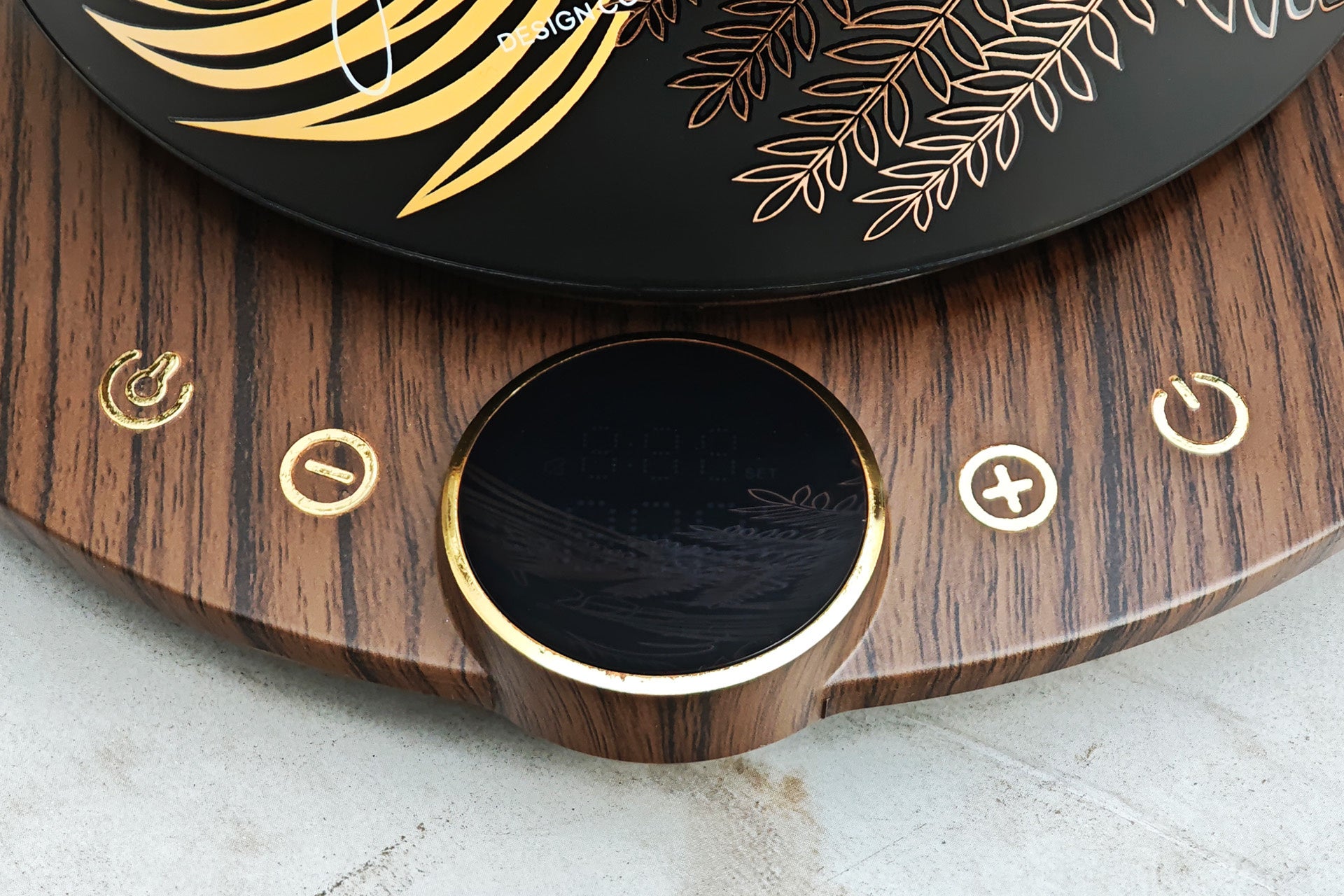 ケトル本体のマットブラック地にブロンズやクリームイエロー系のカラーでデザインすることで、一つ一つの柄は印象的な大きさながらも、それぞれが主張しすぎない印象に。