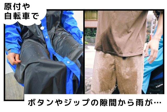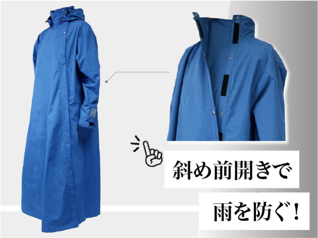 斜め前開きのジッパーを配置することで自転車や原付バイクに乗っている時でも、雨水が自然と流れる設計に。