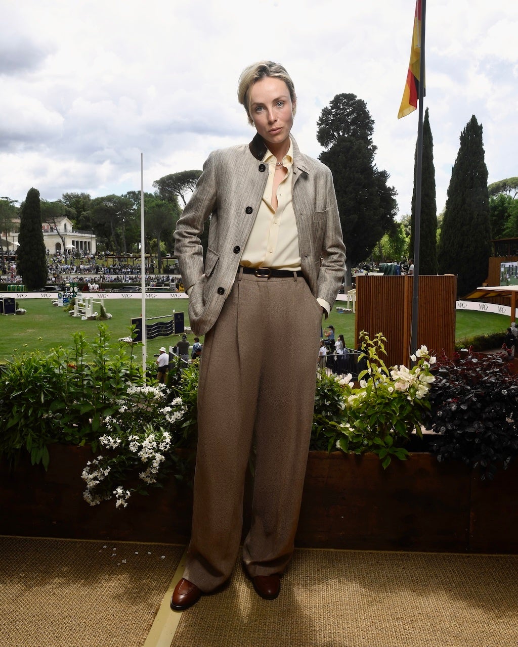 今年もまた、エドウィナ・トップス・アレクサンダーとロレンツォ・デ・ルカは、ロロ・ピアーナの公式ユニフォームを着用しました。独自のネイビーブルーのブリストル製で、マスタード色のカシミヤ・ピマ襟と手仕上げのクレストボタンがあしらわれた改良版のスパーニャ・ジャケットに、快適なテクノボンデッド・ストレッチジャージー製のオプティカルホワイトのジョッパーズパンツを組み合わせています。これらのウェアはロロ・ピアーナの選手のために特別にデザインされたもので、革新的なテクニカル素材により、エレガントなスタイルと究極のパフォーマンスが融合しています。極細のオーストラリス®ウールは、最高の着心地と動きやすさを保証。ピアッツァ・ディ・シエナでのレジャータイムには、選手たちはリネンシルクの3層ベルト・ストーム®製のホーシィー®・ジャケットや、男性用はブリストル製、女性用はマイクロファイバーとカシミヤを独自にブレンドしたウィンドメイト®ストレッチストーム製のロロ・ピアーナ・ボンバーなど、メゾンのアイコンを着用しました。これらのウェアには撥水性と防風性をもたらすストームシステム®加工が施されています。