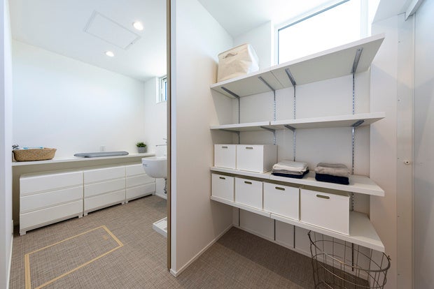▲洗う・干す・たたむ・しまうが一部屋でできるランドリースペースと脱衣室