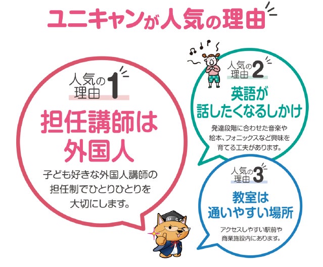 ユニバーサルキャンパスは、京進の英会話教室として1998年に誕生。幼児から小学生までのお子さまを中心に「みんな英語が大好きに!」をコンセプトとし、英語が好きになるような楽しいレッスンを、神奈川、大阪、京都、兵庫、滋賀、そして新しく加わる埼玉の全23校舎で展開中です。2019年には英会話スクールとして日本で初めて「オックスフォード・クオリティ・プログラム」認定校に指定され、世界レベルの高品質な教育プログラムを提供しています。