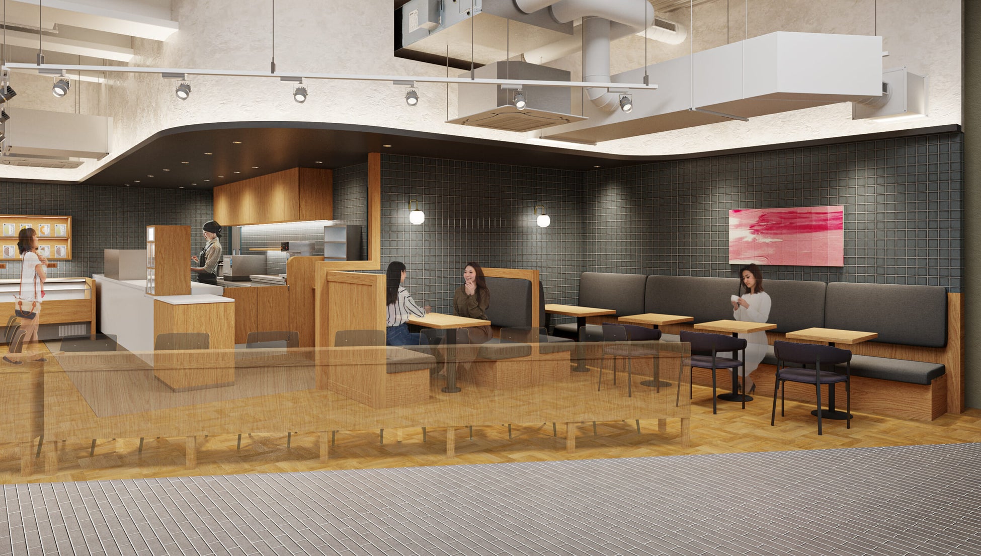 落ち着いた素材感のあるタイルをふんだんに採用し、柔らかい光が高低差のある天井と有機的なラインを引き立てます。どこか電車の客席を思わせるベンチのデザインで、席に座るとほっと一息つける雰囲気。日々の慌ただしい生活の中で、訪れる度スープとゆっくり向き合いながら、ふとリラックスした自分を取り戻せるような場所になれることを願っています。