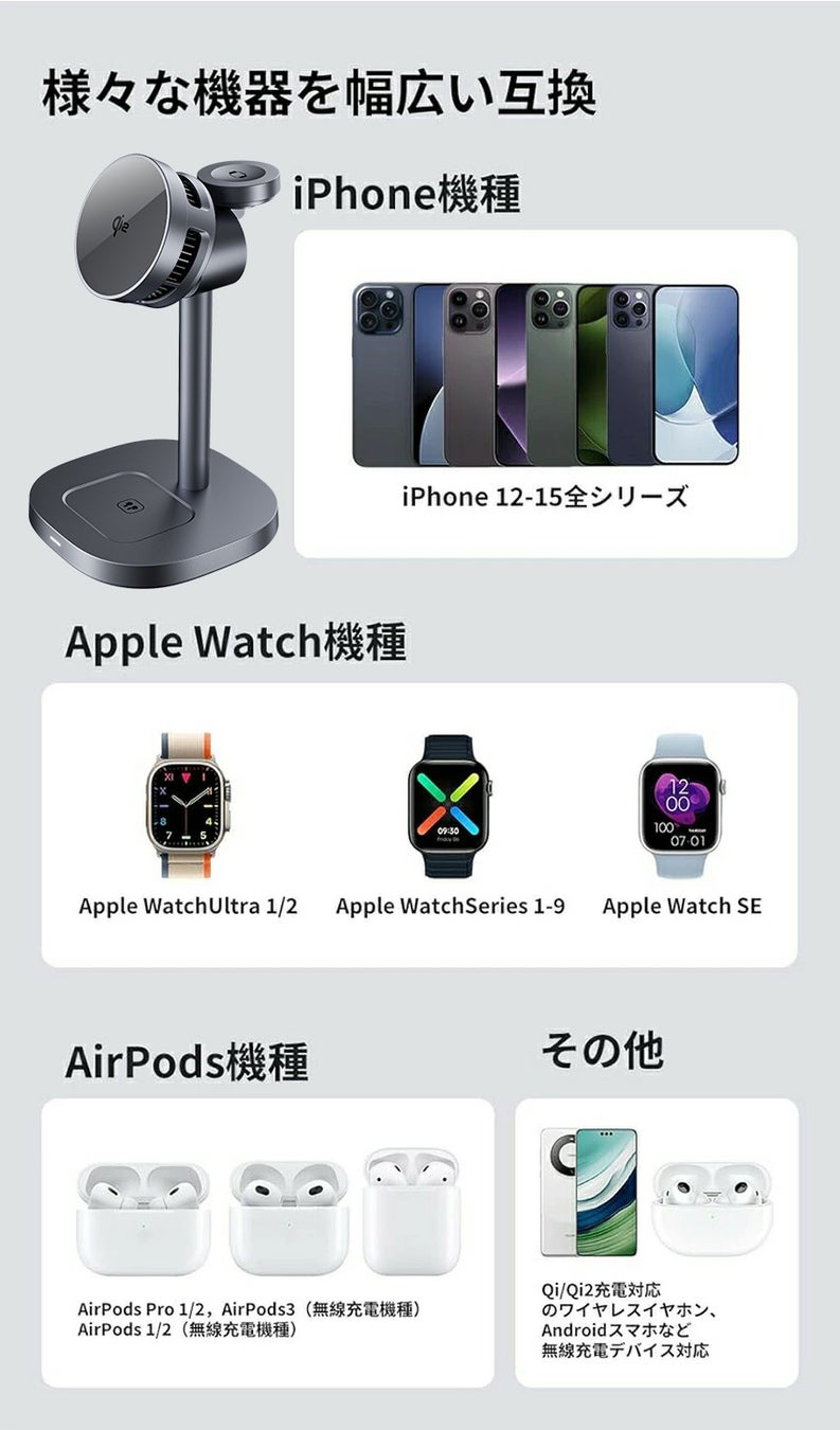 3台の充電器の機能がこの1台に。Qi対応iPhoneシリーズ、AirPodsなどのワイヤレスイヤホン、Apple Watchの3台の同時充電が可能です。