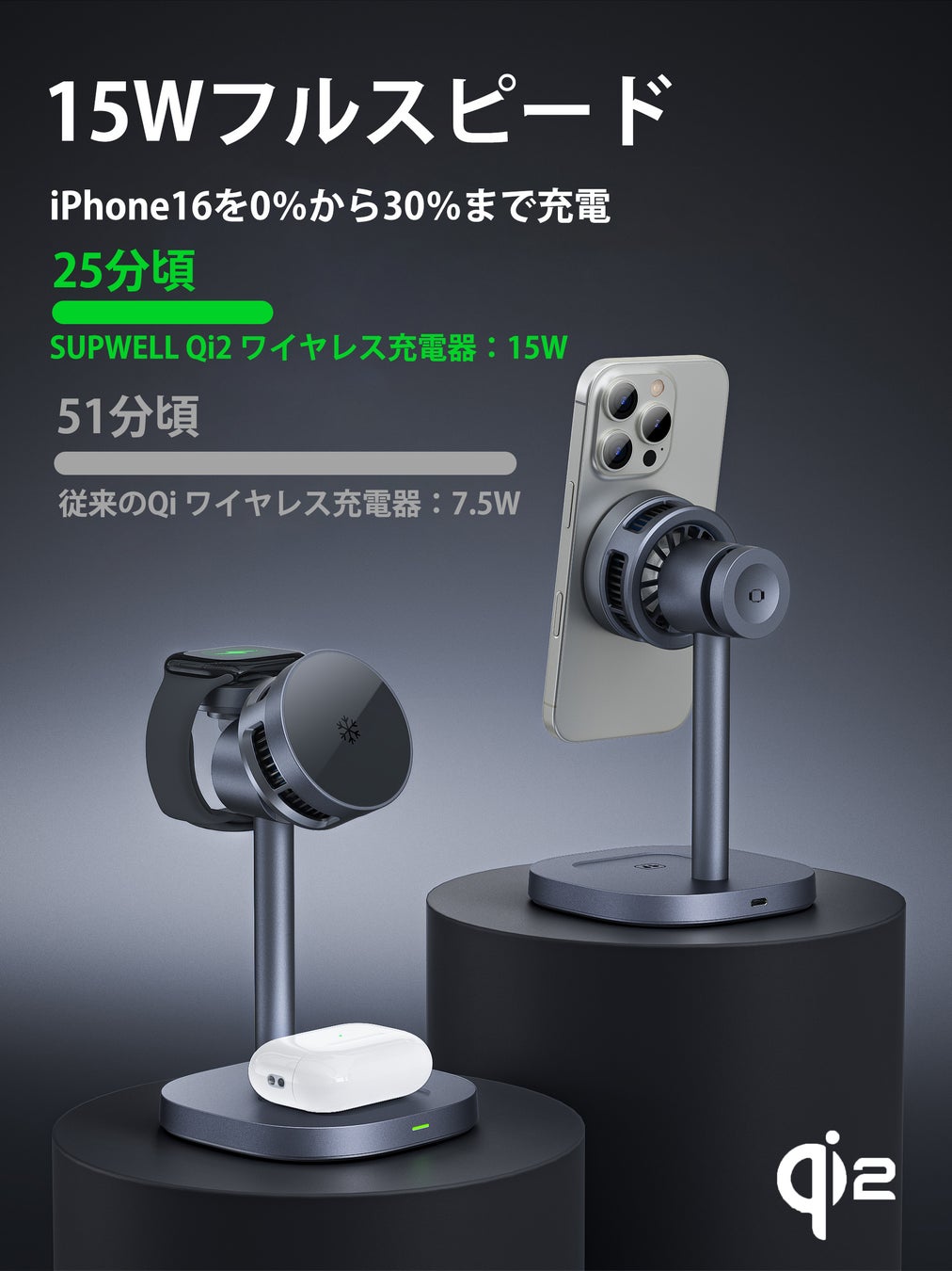ワイヤレス充電の最新規格Qi2の公式認証を取得しています。 従来のQi(7.5W相当)の2倍の最大出力となる15Wの高出力を実現しました。 Qi2対応iPhoneシリーズなどの機器の急速充電が可能です。