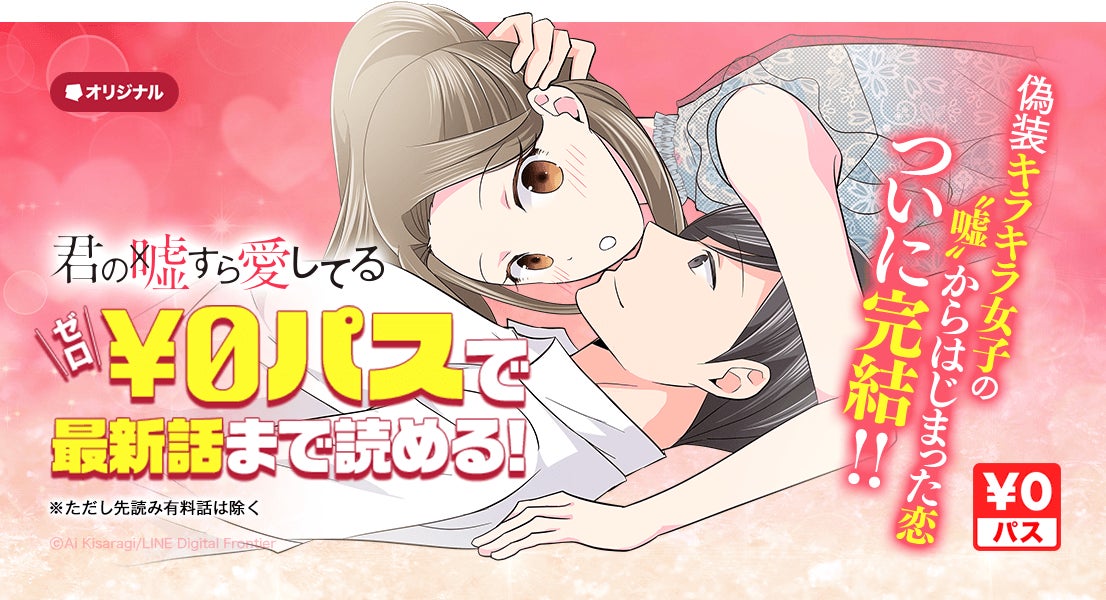 LINE Digital Frontier株式会社(本社:東京都新宿区、代表取締役社長:金 俊九(キム・ジュンク)) は、当社が運営する電子コミックサービス「LINEマンガ」https://manga.line.me/ のオリジナル作品『君の嘘すら愛してる』(作:如月あい)が、4月8日(金)の更新で完結を迎えることを記念し、「¥0パスキャンペーン」を実施します。
