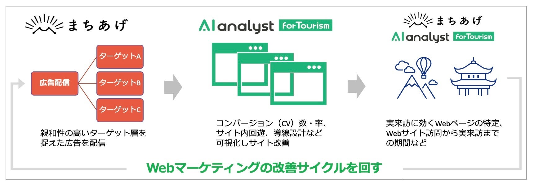 まちあげとAITの連携により、自治体の観光プロモーションに対し、ターゲットを捉えた広告配信、Webサイトの解析及び対象地域への実来訪計測までを、一気通貫でサポートすることが可能になります。広告の効果に加え、Webサイトが観光地の集客にどれほど効果があったかを可視化します。さらに各効果を高めるための改善施策案をご提供し、Webマーケティングと現地来訪の双方の促進を図ります。