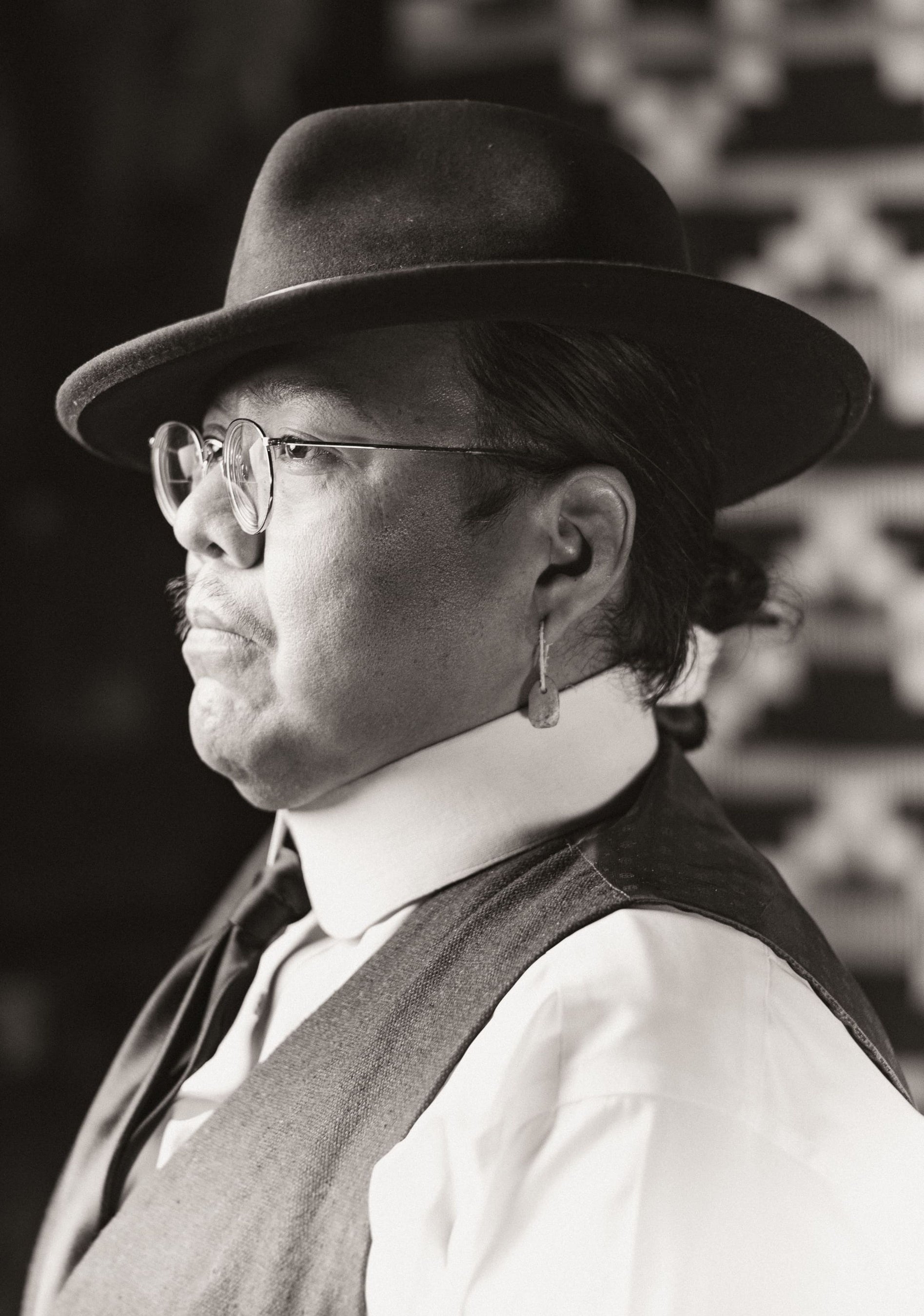ゼフレン・エムは、ナバホ族の物語を伝えるために古代の技法とそれの現代への応用を融合させた作品を制作するマルチアーティスト、歴史家、そしてLGBTQIA+の擁護者です。ディネタ(ナバホ ネイション)で育ち、祖母たちから裁縫や織物、羊の飼育などの伝統を学び、その後、ディネ カレッジのナバホ文化芸術プログラムや多くの年長者たちの指導の下で、織物に関する造詣をより一層深めてきました。