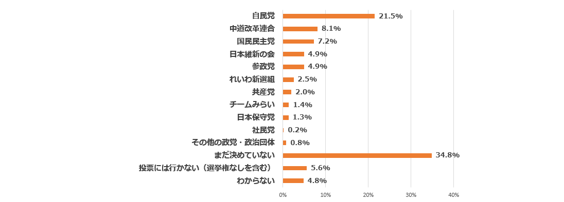 衆院選の比例代表で投票したい政党はどこか聞くと、自民党21.5%、中道改革連合8.1%、国民民主党7.2%、日本維新の会4.9%、参政党4.9%、れいわ新選組2.5%、共産党2.0%、チームみらい1.4%、日本保守党1.3%、社民党0.2%、その他の政党・政治団体0.8%、まだ決めていない34.8%だった。