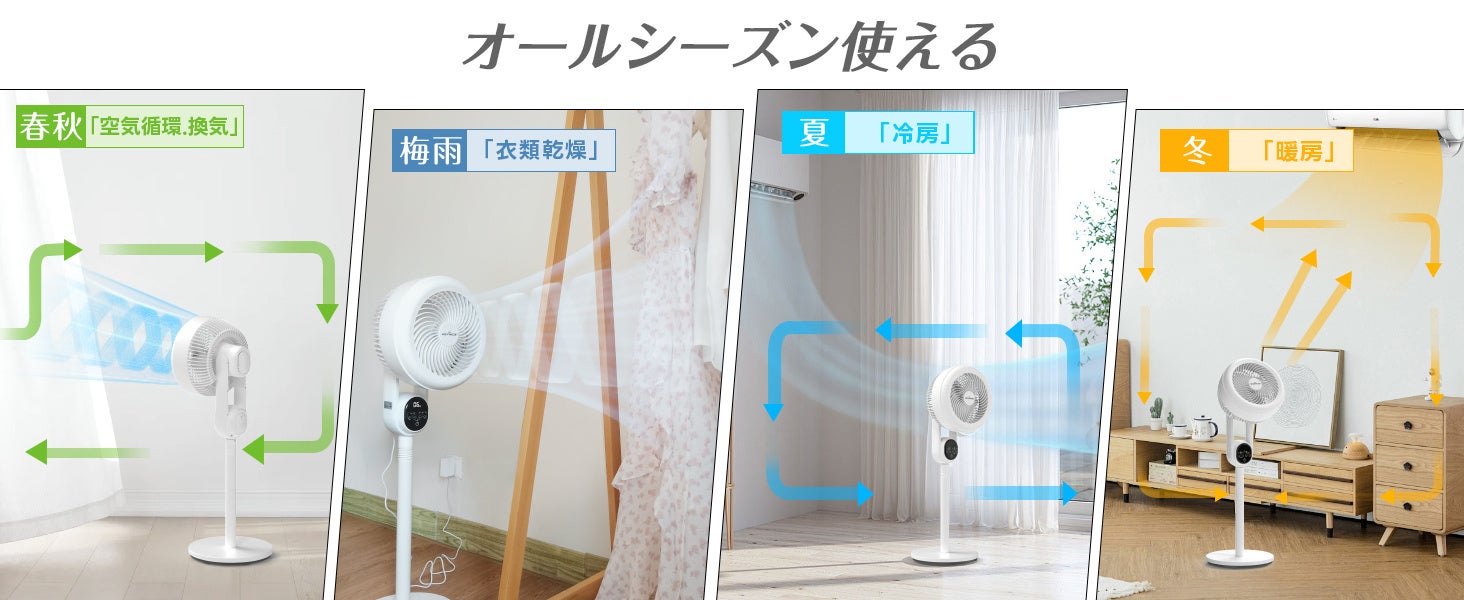 室内の空気を循環できるので、扇風機としてだけでなくサーキュレーターとしても使え、季節を問わず1年中快適な風と共に暮らせます。