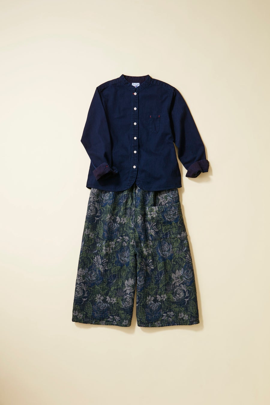 岡山県井原市にアトリエ兼工場を構え、オリジナルの生地を企画するなどこだわりのものづくりをしているデニム専門店。経年変化を楽しめるシンプルなスタンドカラーシャツに、オリジナル素材を使用した花柄のフレアーパンツが登場。