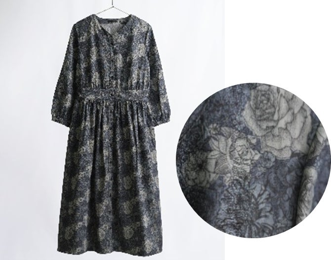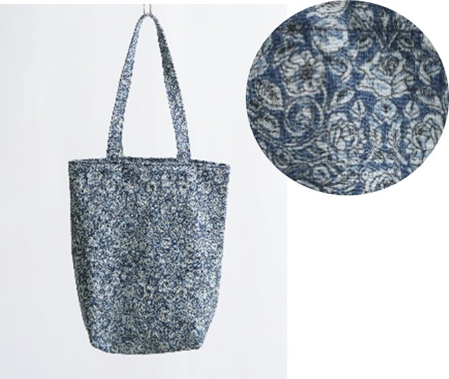 「松屋の地域共創」の取組みの一環として、広島県の「山陽染工(株)」が開発した「リバティプリントの抜染デニム」を全国に先駆け製品化。写真のトートバッグ、ワンピースなどを展開します。緻密に色を抜くことで細かな花柄を表現するリバティデニムは、高い技術力を必要とするため、実現できたのは「山陽染工(株)」が世界で初めてです。