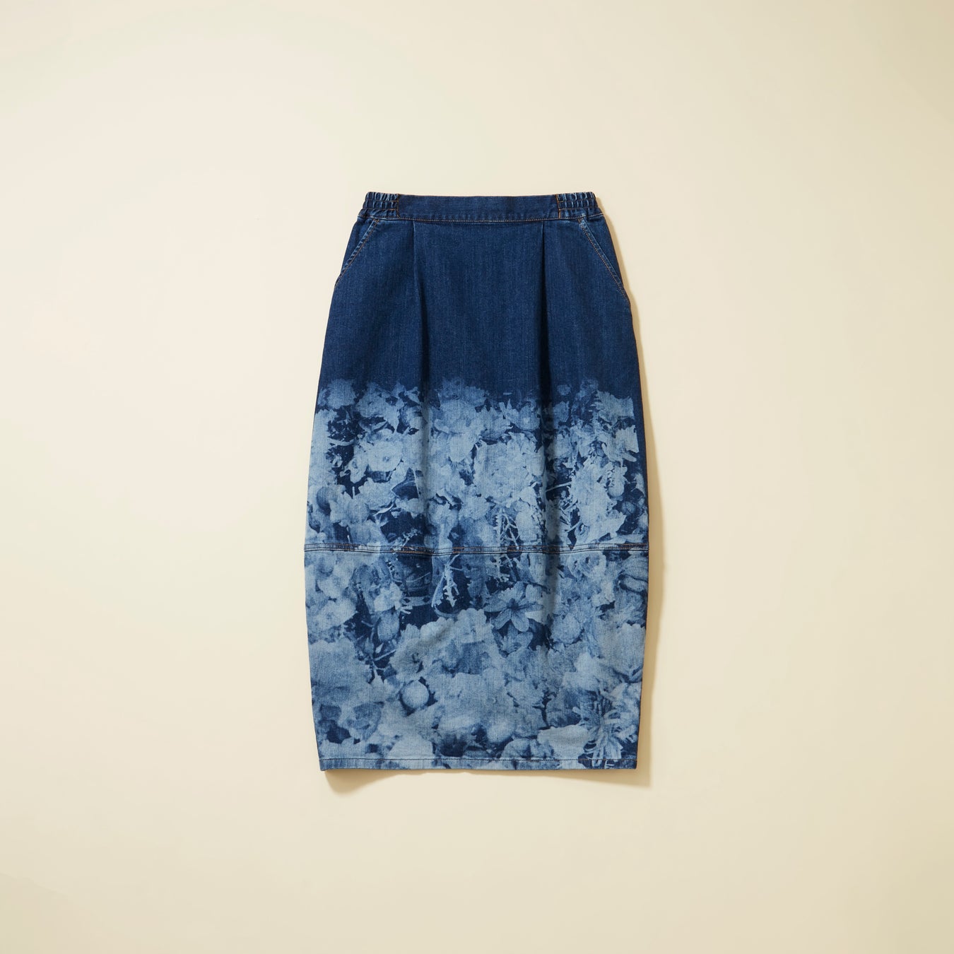 広島県の〈カイハラ〉のストレッチデニムを使用した、程よく丸みのあるシルエットのスカート。プログラミングされた花柄のデータを、レーザーでデニム生地の表面に焼き付けて柄を出しています。