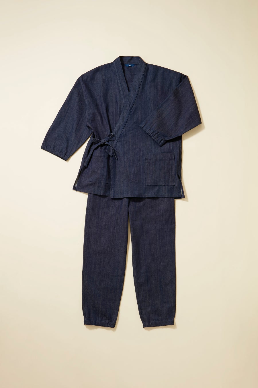 国産ジーンズ発祥の地・岡山県児島市のデニムを使用し、京都の和装小物の老舗〈荒川〉が伝統の技で手掛けた作務衣。デイリーに着やすいカジュアルなシルエットに仕上げています。