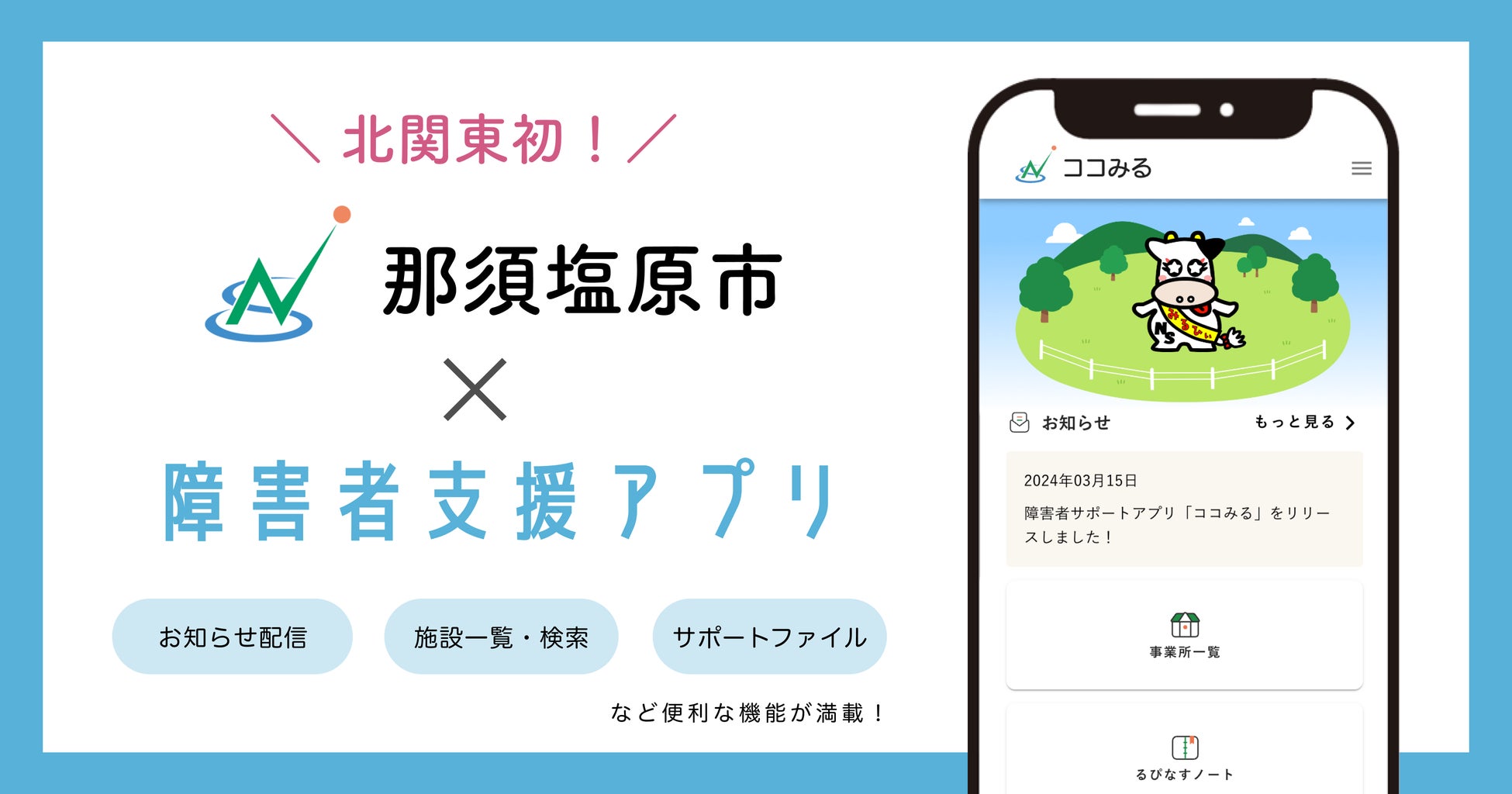 自治体向けサービスを開発する株式会社ミラボ(本社:東京都千代田区、代表取締役:谷川一也、以下「ミラボ」)の「障害者支援アプリ」が、栃木県那須塩原市に導入され、「ココみる」として、2024年3月15日より提供を開始しました。北関東エリアでは初導入、また 発達に支援が必要なこどもの成長記録や支援内容等をアプリ内で記録・管理する「サポートファイル」を新機能として搭載しております。