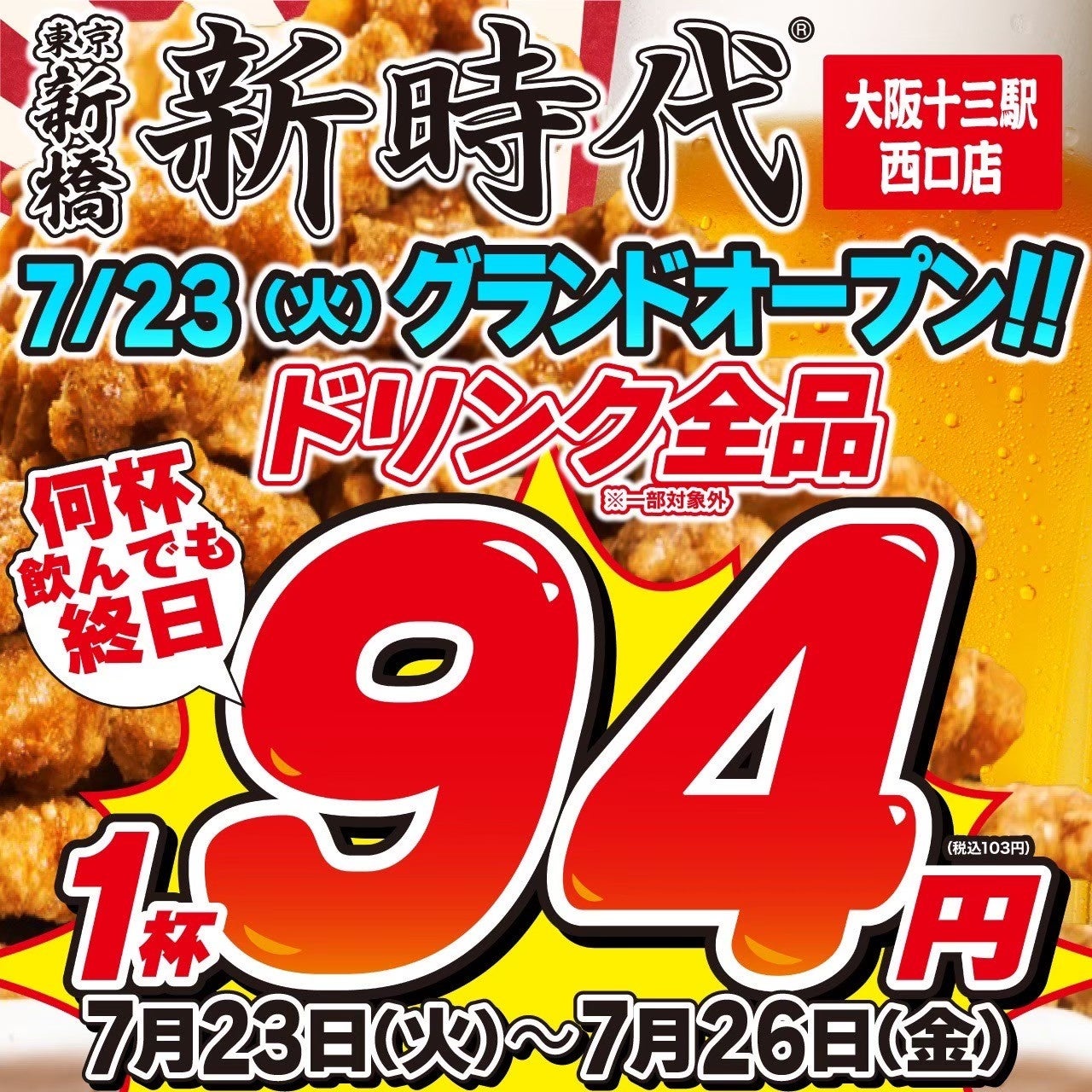 「新時代 大阪十三駅西口店」のオープンを記念し、ドリンク全品94円(税別)キャンペーンを開催します。