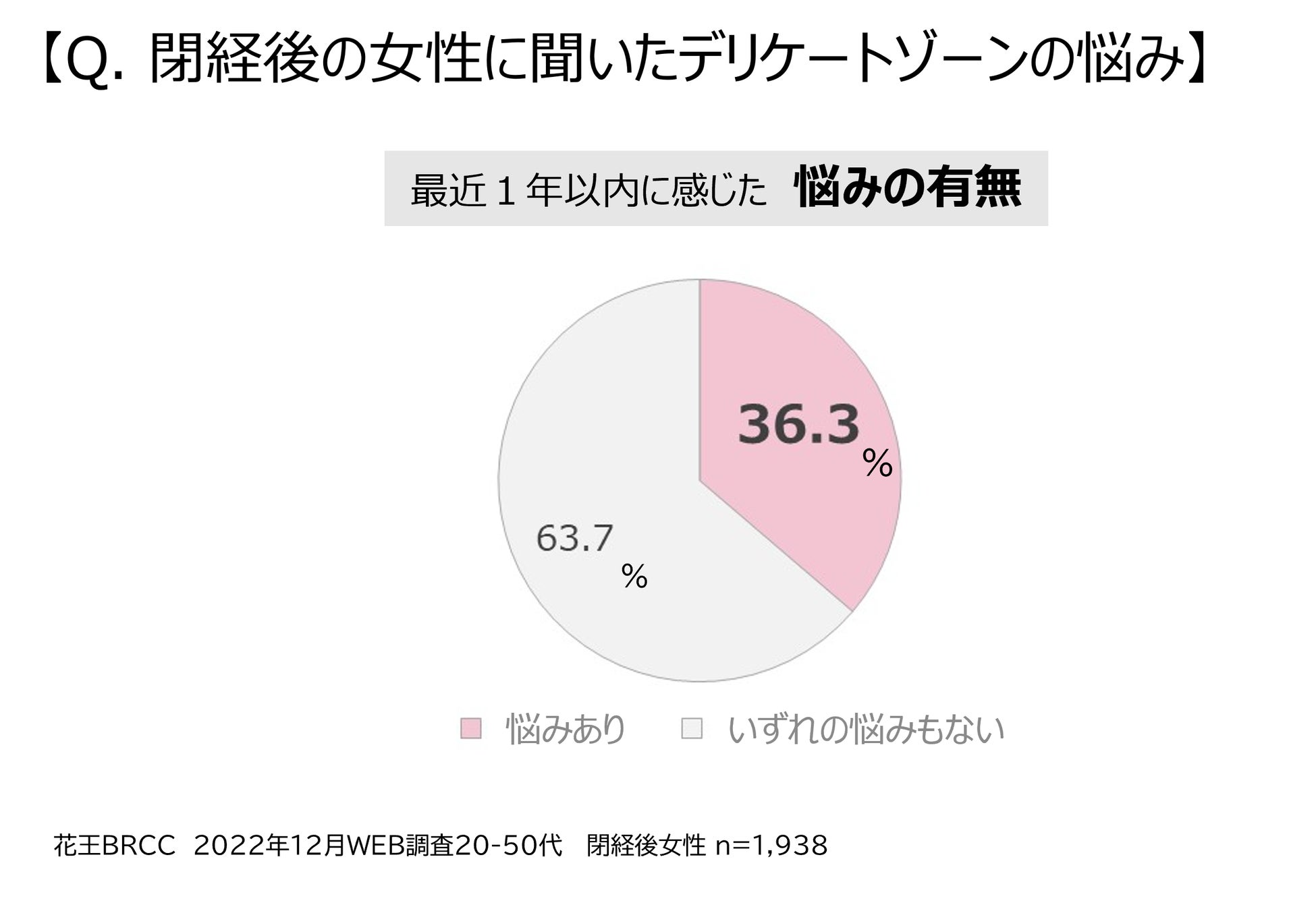 定量調査では、閉経後の女性の36.3%がデリケートゾーンに関して悩みがあることが判明。具体的には、においや蒸れ、乾燥などが挙げられました。