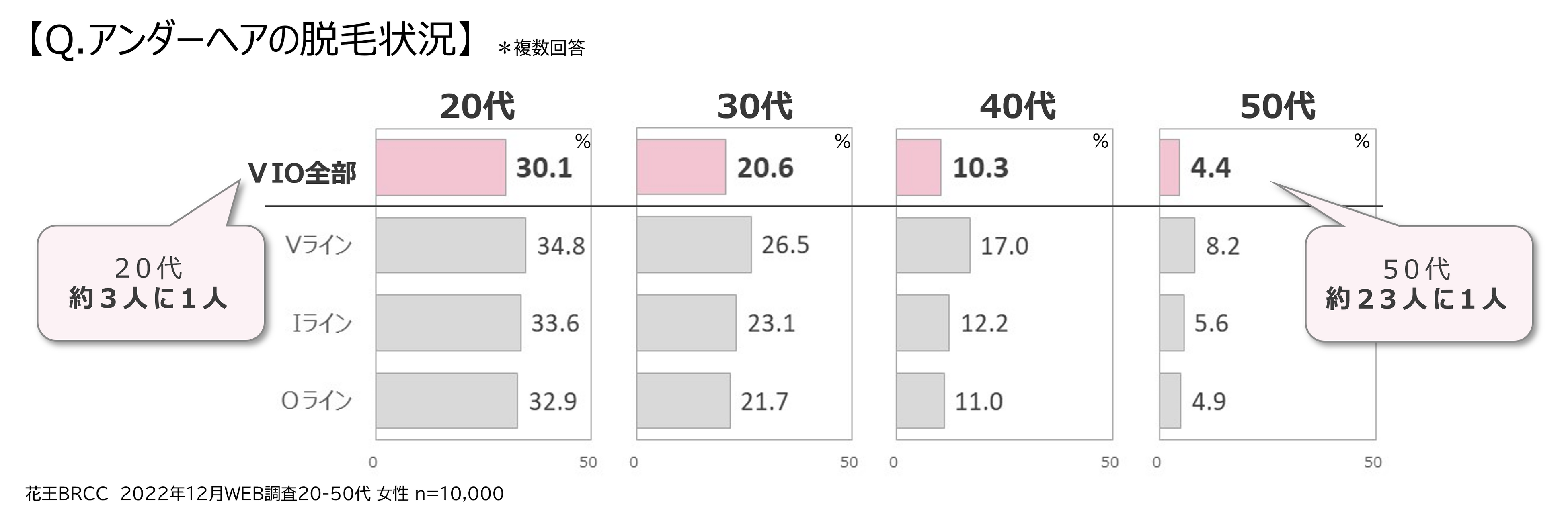 アンダーヘアの脱毛状況について聞いたところ、20代の3割がVIO全部の脱毛を実施していました。年代が上がるにつれ脱毛実施者は少なく、年代間ギャップが非常に大きい結果となりました。