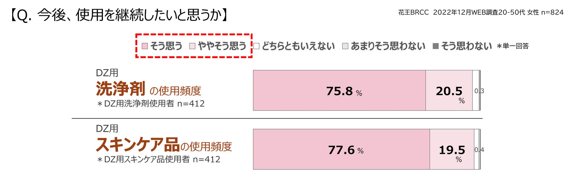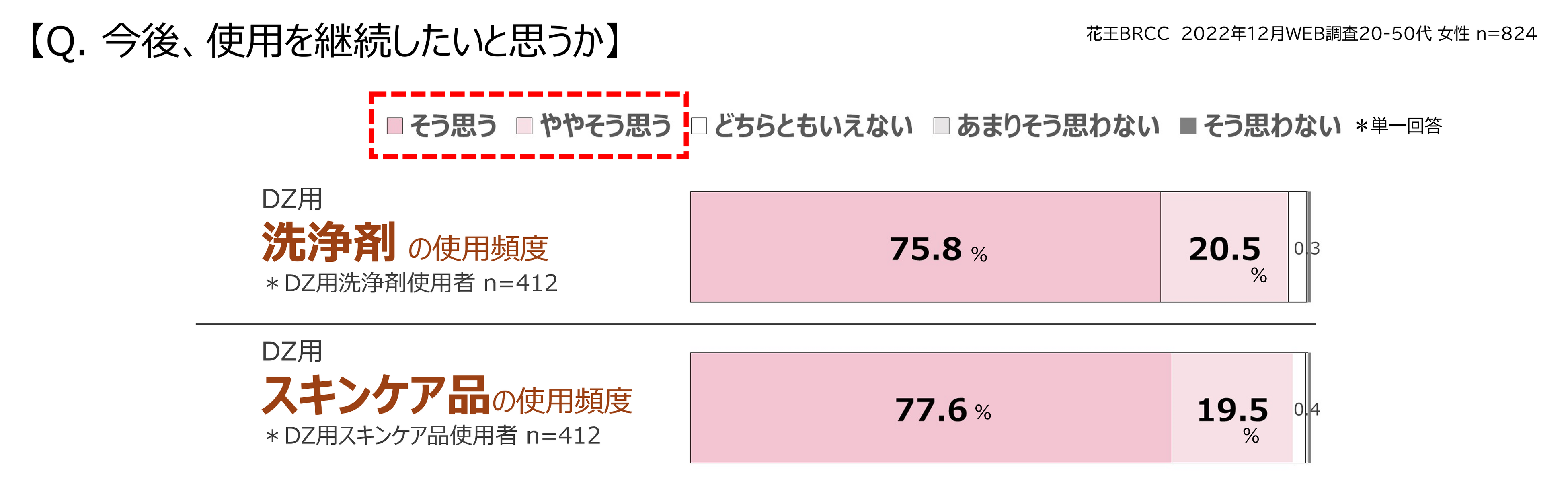 定量調査において、デリケートゾーンの肌用の洗浄剤使用者とスキンケア品使用者に対し、ケア習慣について質問をした結果、毎日使用している人が9割以上でした。使い続けている理由としては、「ボディケアの一環」、「身だしなみの一部と思うようになった」など、習慣化していることがわかりました。また、全体の95%以上が今後も継続して使用したいと思っていることが明らかに。