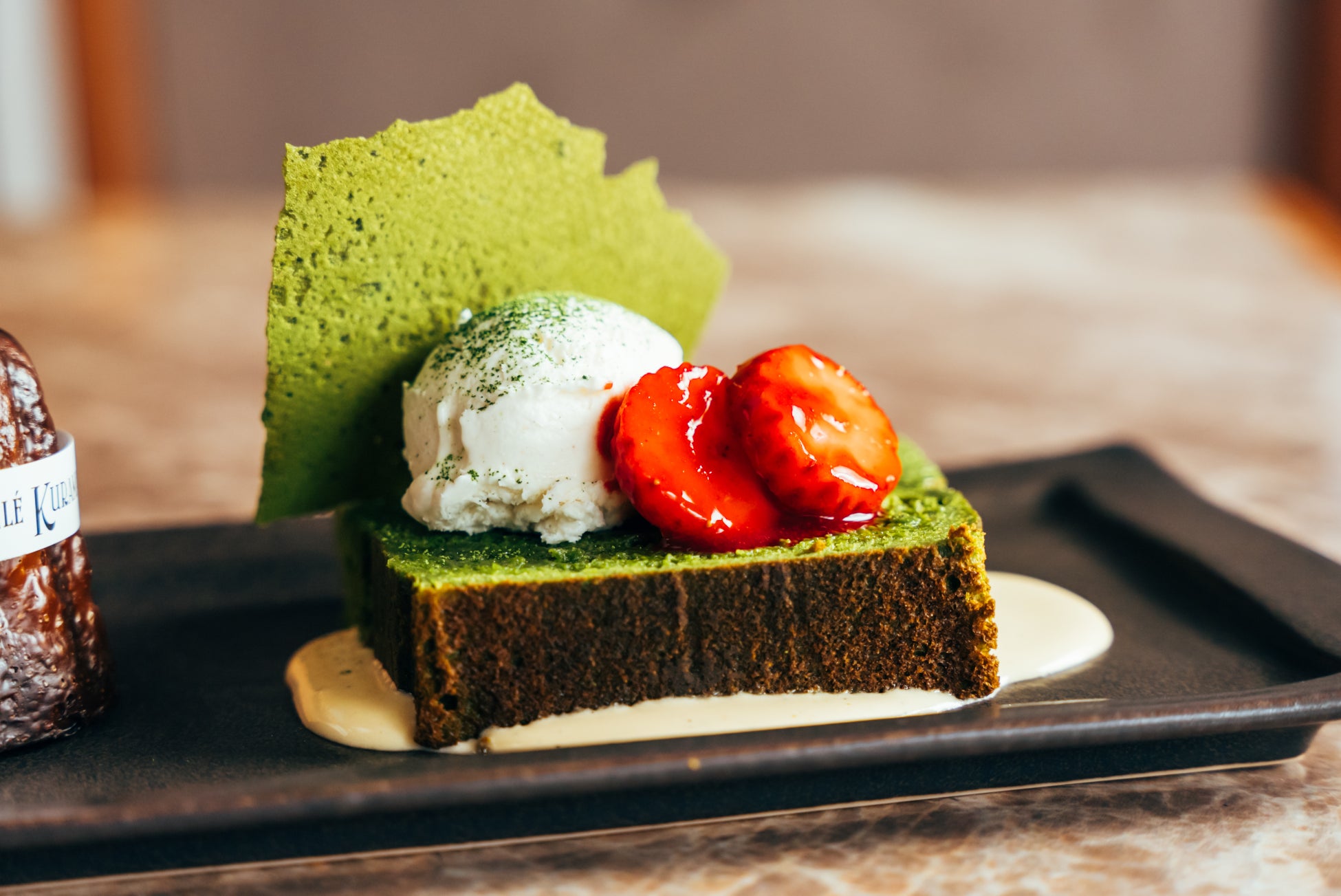 カルダモンのアイスと抹茶のテリーヌと苺。意外な組み合わせをお楽しみください。グランカヌレにのせて食べていただくのもおすすめです。