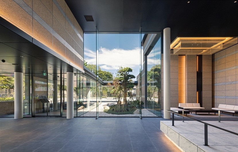 全邸南向き全19タイプの住戸プラン(53㎡~183㎡台)は、2LDK~4LDKとなっており、最上階には140㎡~183㎡台のプレミアムプランを設定。住まう方々の多彩なライフスタイルにお応えできるようバリエーション豊かな住戸プランをご用意いたしました。メインエントランス棟は、行き交う人々を迎え入れる邸宅の「顔」として独立した一棟での計画とし、ゆとりのあるアプローチやガーデン、車寄せといった邸宅としての在り方を魅せられるような空間構成を目指しました。グランドロビーは高さ5mを超える壮大な吹き抜け空間とし、地域に馴染みのある御影石で仕上げました。グランドロビーから住宅棟へと続くアプローチや、そこに併設するオーナーズラウンジでは、六甲山麓の風光に恵まれた枯山水のセンターガーデンが人々を上質な体験の場へお連れいたします。