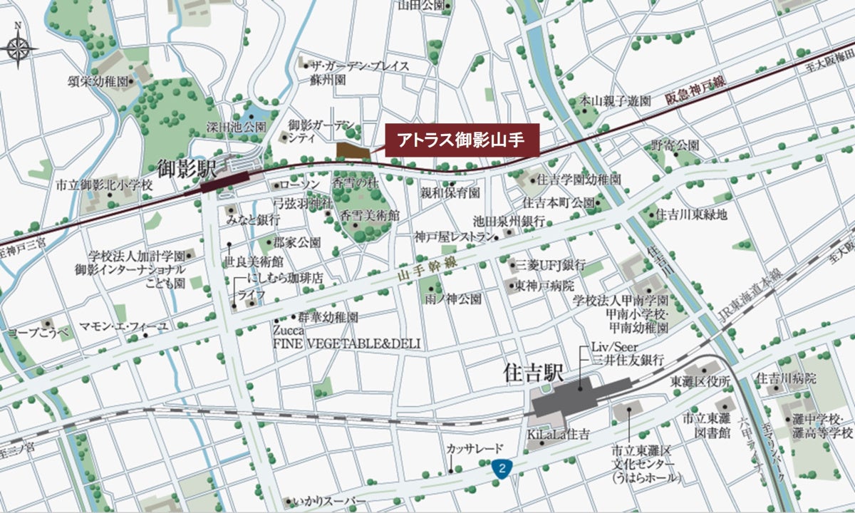 阪急神戸線「御影」駅徒歩5分、JR東海道本線(神戸線)「住吉」駅徒歩13分 |